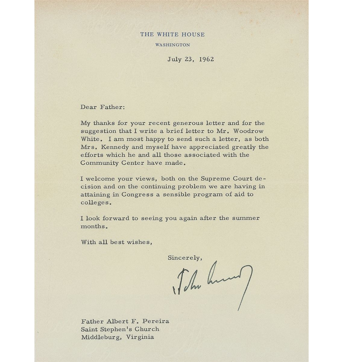 TLS as president, one page, 6.75 x 8.75, White House letterhead, July 23, 1962. Letter to Father Albert Pereira, in part: “My thanks for your recent generous letter and for the suggestion that I write a brief letter to Mr. Woodrow White. I am most happy to send such a letter, as both Mrs. Kennedy and myself have appreciated greatly the efforts which he and all those associated with the Community Center have made. I welcome your views, both on the Supreme Court decision and on the continuing problem we are having in attaining in Congress a sensible program of aid to colleges.” In fine condition, with some mild toning along top edge. Accompanied by two TLSs to Pereira from Press Secretary Pierre Salinger, and a third from Pereira to Kennedy’s assistant, Kenneth O’Donnell.