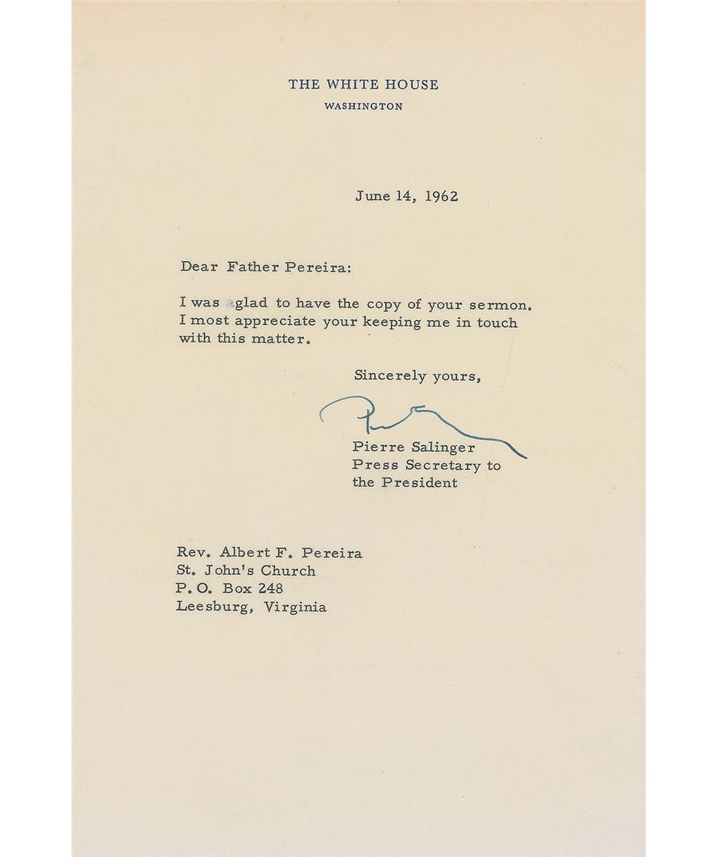 A week after moving his family to the White House at the start of his presidency, Kennedy signed a lease for the Glen Ora farm in Middleburg, Virginia, a charming country retreat about an hour west of Washington. On their first visit in early February of 1961, they attended mass at Middleburg Community Center, where they met the presiding Reverend Albert Pereira. Over the next three years, they grew very close with the reverend, joining forces to help transform the suddenly famous town from a segregated and insulated place to a more united and open-minded community. In the accompanying letter from Pereira, dated April 5, 1962, he writes, ‘One year ago the Kennedy’s [sic] were not so welcome in Middleburg. Not so today. Their dislike of Democrats, their jealousy of such socially prominent people has completely disappeared.’ A charming letter from the busy president to the small town priest who became a dear friend during his three years in office.