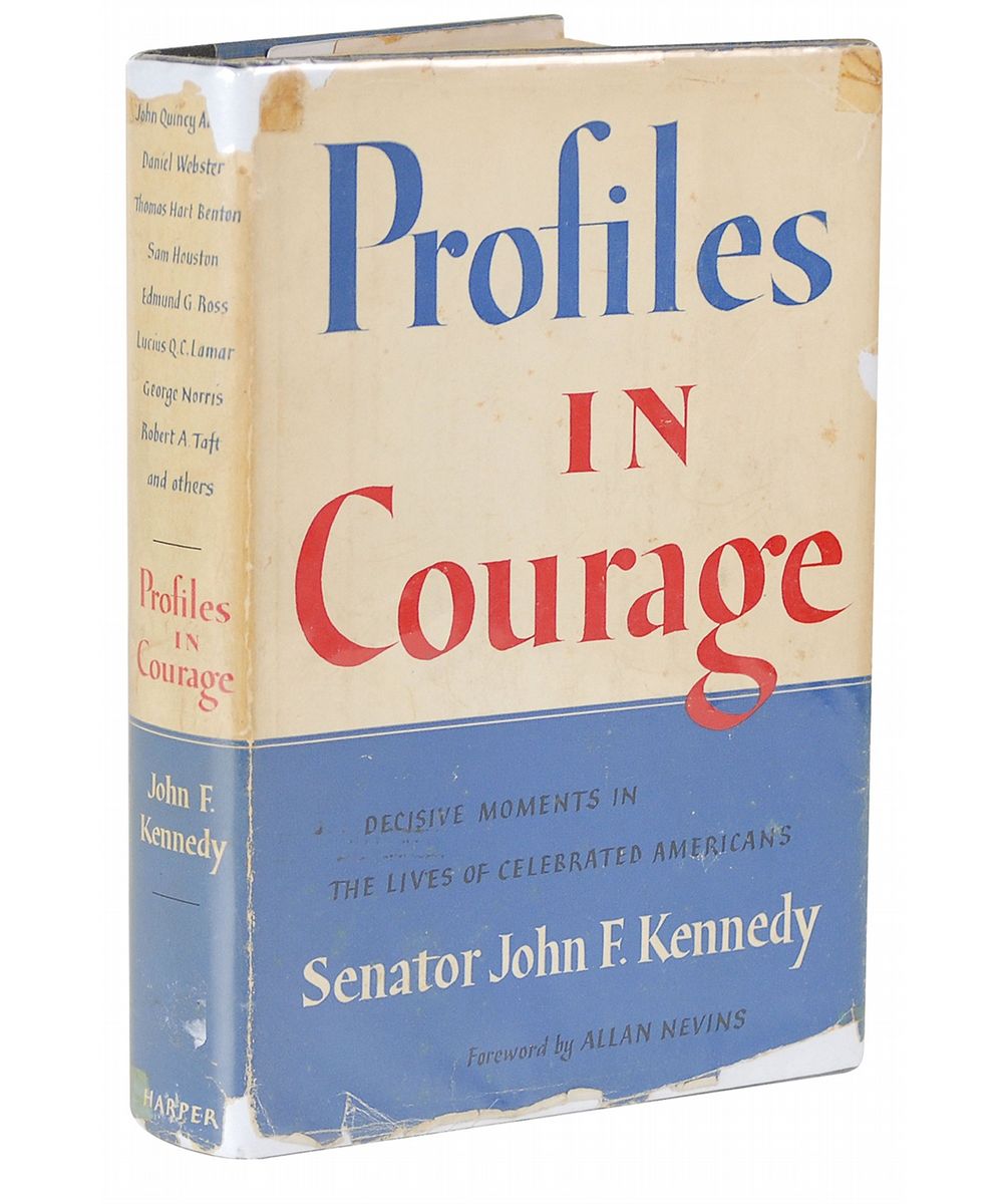Signed book: Profiles in Courage. Later printing. NY: Harper and Brothers, 1956. Hardcover with dust jacket, 6 x 8.5, 266 pages. Signed and inscribed in fountain pen on the first free end page, “To Anthony Amari, Best regards, John Kennedy.” Autographic condition: fine, with small owner’s signature along top of signed page, as well as some scattered mild soiling. Book condition: VG-/VG-.