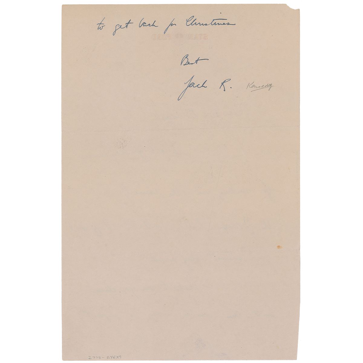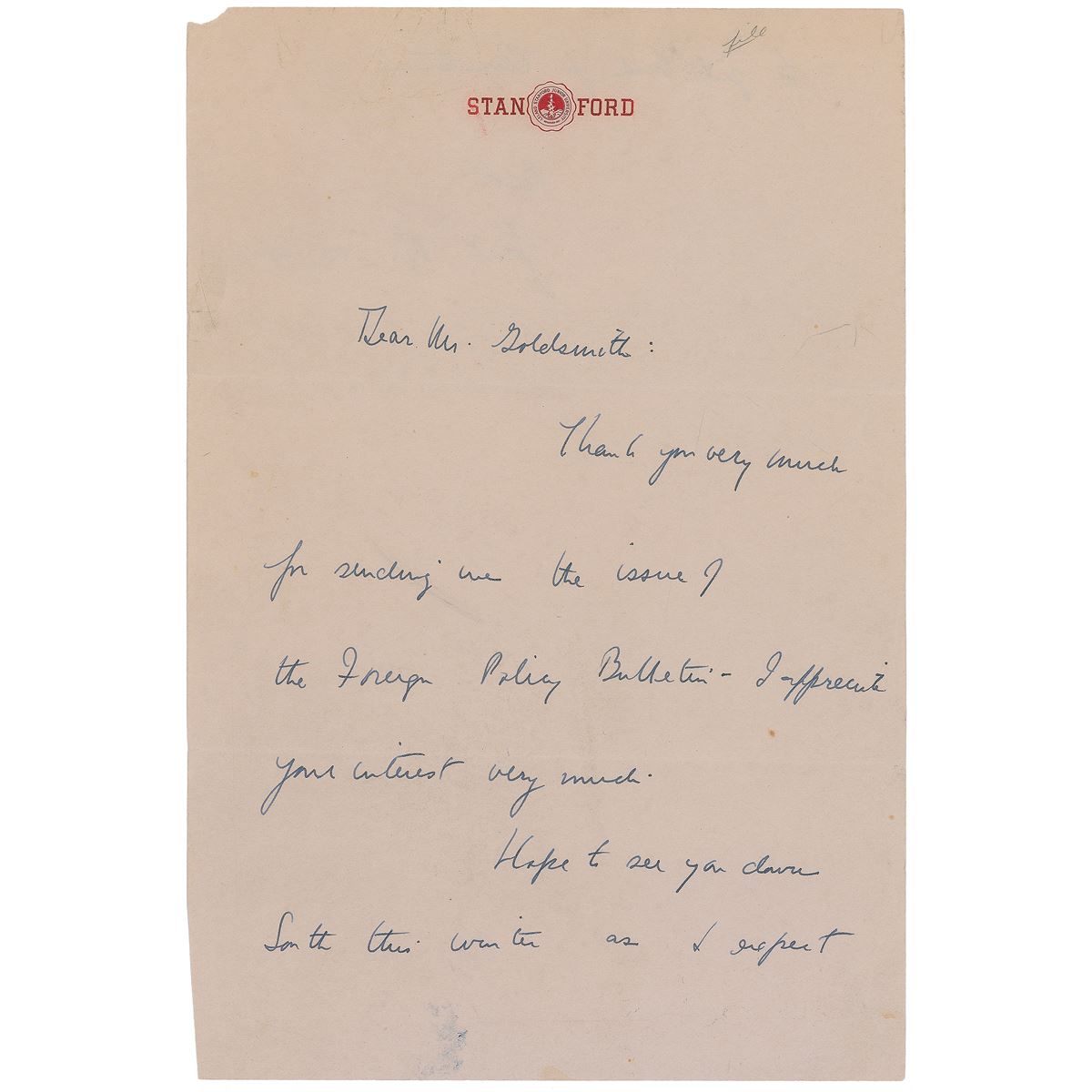 Scarce ALS signed “Jack K.,” one page both sides, 7 x 10.5, Stanford University letterhead, no date but circa 1940. Letter to Mr. Goldsmith. In full: “Thank you very much for sending me the issue of Foreign Policy Bulletin. I appreciate your interest very much. Hope to see you down South this winter as I expect to get back for Christmas.” In fine condition, with a few stray marks, a chip to one corner, and a trimmed left edge. Earlier in 1940, the soon-to-be Harvard grad published his senior thesis, Why England Slept, which became a best seller. After graduating and unsure of his next move, Kennedy enrolled in the politically conservative Stanford Graduate School of Business in the fall. He soon left the school and decided to join the Navy in 1941, making letters from his time at Stanford quite scarce.