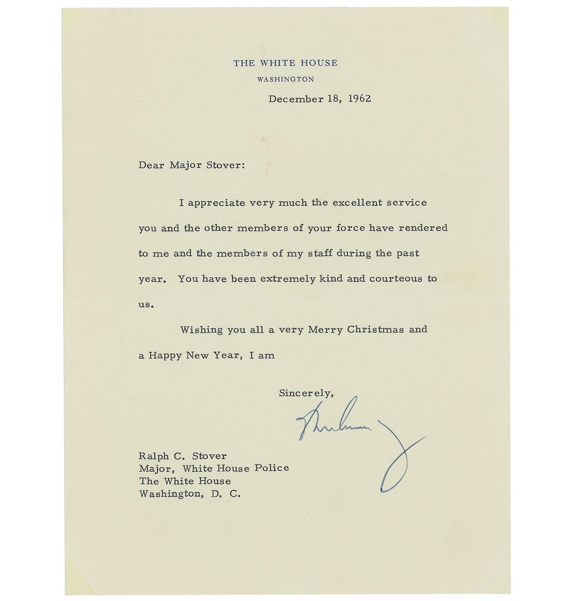 TLS as president signed “John Kennedy,” one page, 6.75 x 8.75, White House letterhead, December 18, 1962. Letter to Major Ralph Stover, in full: “I appreciate very much the excellent service you and the other members of your force have rendered to me and the members of my staff during the past year. You have been extremely kind and courteous to us. Wishing you all a very Merry Christmas and a Happy New Year.” In fine condition, with a tiny spot of soiling and trivial adhesive remnants to the corners from previous display. Ralph Stover joined the Secret Service's uniformed White House Police Force in 1940, and for the next 27 years oversaw the protection of five American presidents. Serving as the Force's chief beginning in 1958, he was especially close with the Kennedys, earning the affectionate nickname 'Smokey' from JFK for his shared last name with the popular comic strip character Smokey Stover. A charming letter of thanks to his important protector and friend, who would forever lament his absence from Kennedy's tragic trip to Dallas the following fall.