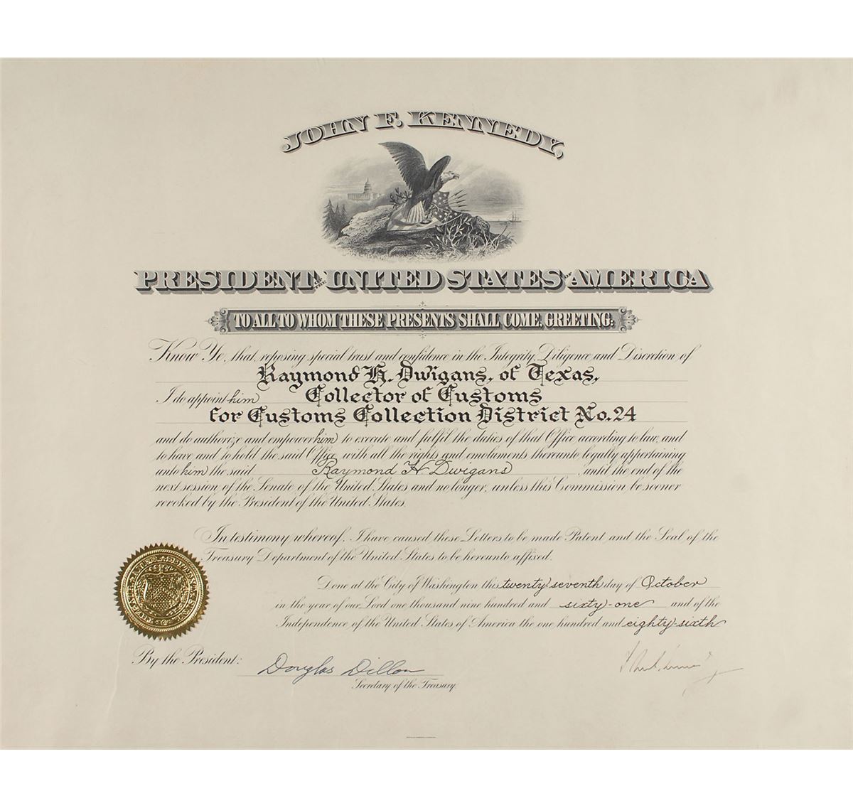 Partly-printed DS as president, one page, 20 x 16, October 27, 1961. President Kennedy appoints Raymond G. Dwigans of Texas as “Collector of Customs for Customs Collection District No. 24.” Signed at the conclusion by President Kennedy and countersigned by Secretary of the Treasury Douglas Dillon. The crisply embossed gold seal affixed to the lower left remains fully intact. Skipping to a few letters of the signature, light soiling, and a few vertical creases extending up from the bottom edge, otherwise fine condition. Rolled.