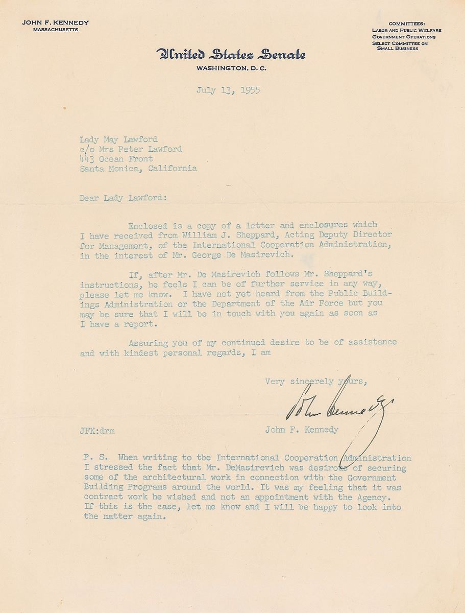TLS, one page, 8 x 10.5, United States Senate letterhead, July 13, 1955. Letter to Lady May Lawford sent care of her daughter-in-law, his sister Pat Kennedy, who was married to actor Peter Lawford. In part: “Enclosed is a copy of a letter and enclosures which I have received from William J. Sheppard, Acting Deputy Director for Management, of the International Cooperation Administration, in the interest of Mr. George De Masirevich…I stressed the fact that Mr. DeMasirevich was desirous of securing some of the architectural work in connection with the Government Building Programs around the world. It was my feeling that it was contract work he wished and not an appointment within the Agency. If this is the case, let me know and I will be happy to look into the matter again.” In fine condition, with the lower horizontal mailing fold passing through the bottom of the signature. Born in Hungary, George De Masirevich ran a successful private architectural practice in southern California and had just become a naturalized US citizen in April 1955. A desirable association piece within the Kennedy family, connecting the popular politician with the glamor of Hollywood.