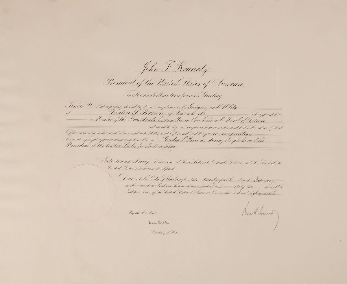 Partly-printed DS as president, one page, 23 x 19, February 24, 1962. President Kennedy appoints MIT professor of electrical engineering Gordon S. Brown as “a Member of the President’s Committee on the National Medal of Science.” Signed at the conclusion by President Kennedy and countersigned by Secretary of State Dean Rusk. In fine condition, with scattered creases and trivial foxing to bottom edge. Accompanied by the original mailing tube.