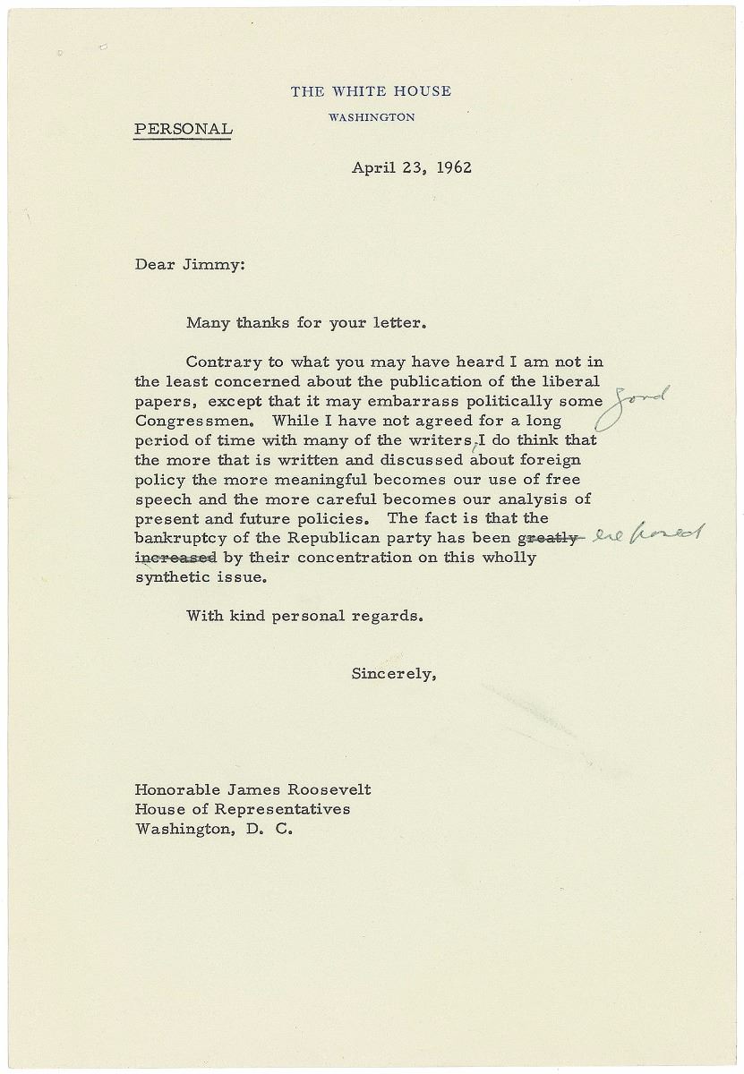 Unsigned personal draft letter, one page, 7 x 10.25, White House letterhead, April 23, 1962. Letter to Californian Congressman James Roosevelt, in full: “Many thanks for your letter. Contrary to what you may have heard I am not in the least concerned about the publication of the liberal papers, except that it may embarrass politically some good Congressmen. While I have not agreed for a long period of time with many of the writers, I do think that the more that is written and discussed about foreign policy the more meaningful becomes our use of free speech and the more careful becomes our analysis of present and future policies. The fact is that the bankruptcy of the Republican party has been (greatly) exposed (increased) by their concentration on this wholly synthetic issue.” President Kennedy makes a few handwritten emendations in pencil, adding “good” and “exposed,” while striking through “greatly” and “increased.” In fine condition, with trivial soiling and staple holes to upper left corner. Accompanied by the final onionskin draft of the letter. A volume of twelve anonymously written essays, The Liberal Papers, attracted the ire of the GOP, and in particular former Vice President Richard Nixon, for its apparent advocacy and ‘unilateral goodwill toward the international Communist conspiracy.’ In spite of a public letter from the White House repudiating the stance of the essays—a move no doubt aimed at curbing Republican agitation—Kennedy never formally denounced the publication’s ideas; he simply didn’t always agree with its writers.