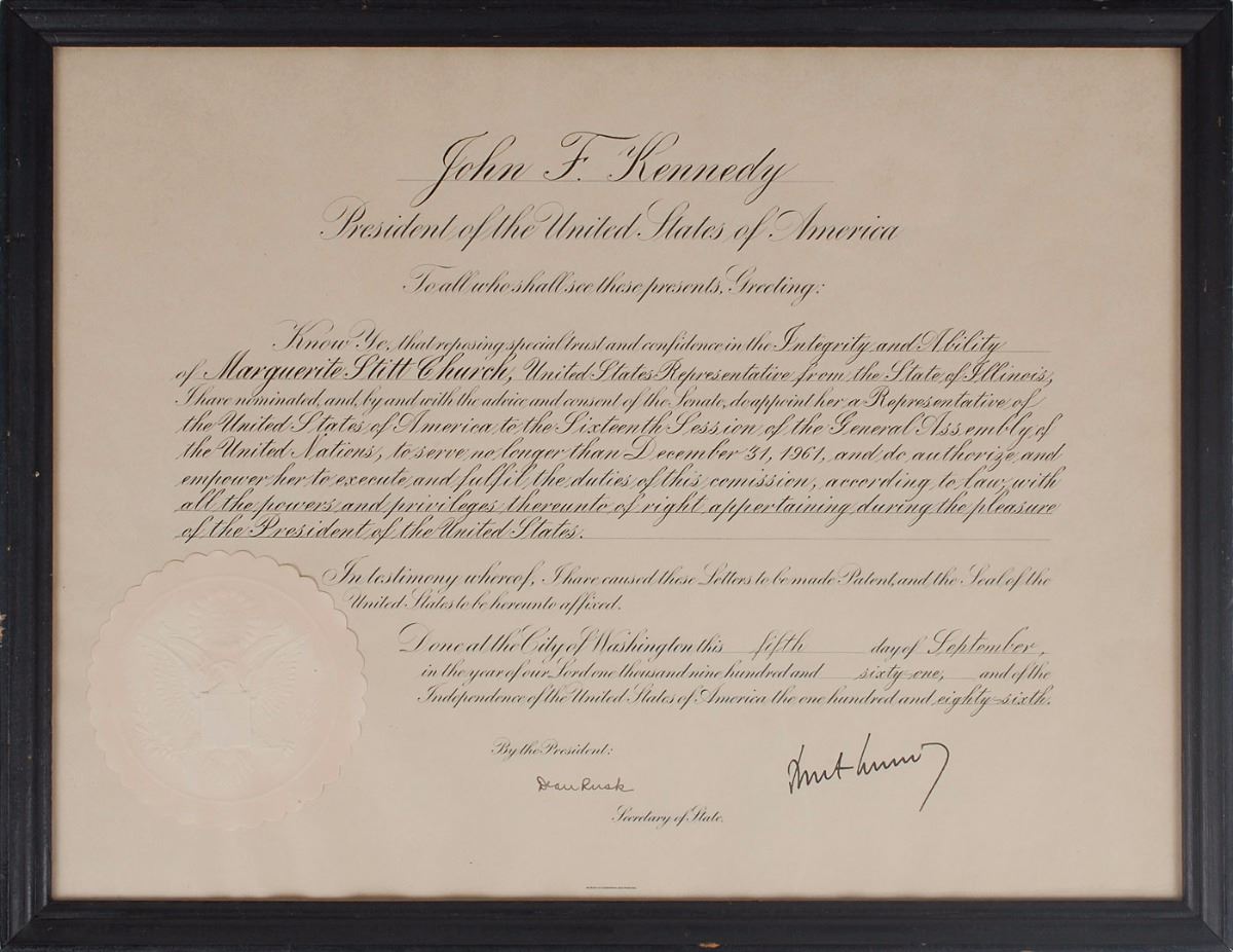 Partly-printed DS as president, one page, 15 x 11.25, September 5, 1961. President Kennedy appoints Congresswoman Marguerite Stitt Church of Illinois as “a Representative of the United States of America to the Sixteenth Session of the General Assembly of the United Nations.” Boldly signed at the conclusion by President Kennedy and countersigned by Secretary of State Dean Rusk. The white paper seal affixed to the lower left remains crisp and fully intact. Framed and in fine condition.