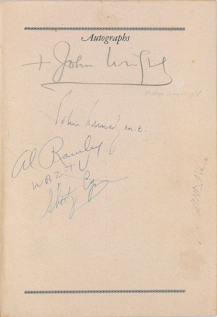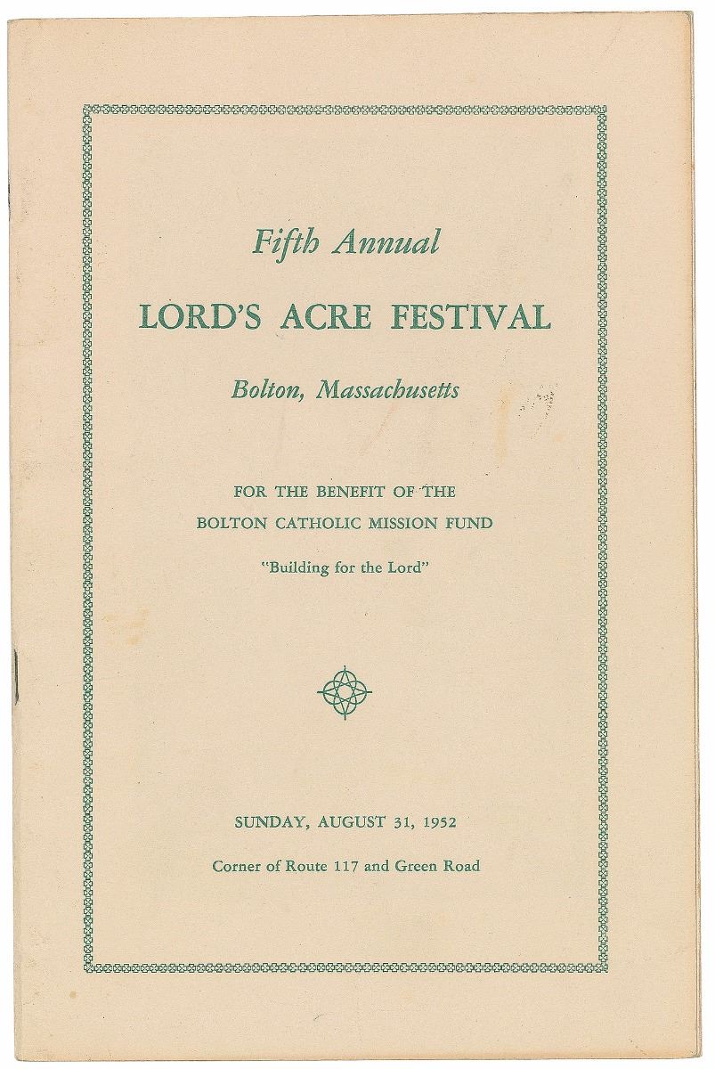 Program for the Fifth Annual Lord’s Acre Festival in Bolton, Massachusetts, on August 31, 1952, signed inside in ink, “John Kennedy M. C.,” and in pencil by Bishop John Wright. Also signed by a couple local celebrities. In fine condition. At this time Kennedy was amidst a heated campaign for a seat in the Senate, with the election to come just over two months later. This is an especially significant item as a program for a Catholic event; Kennedy’s religion was the subject of much discussion and controversy during both his senatorial and presidential campaigns.