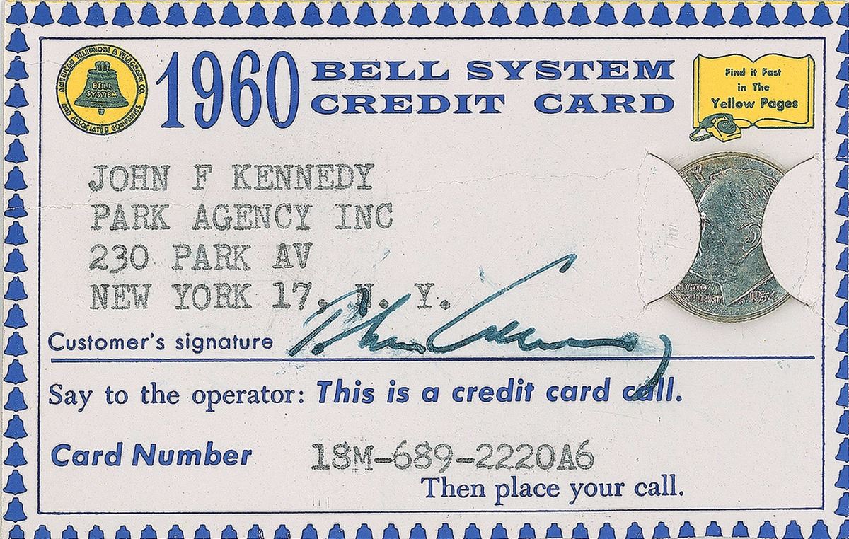 Ink signature, “John Kennedy,” on his personal 3.5 x 2.25 1960 Bell System credit card bearing Kennedy’s Park Agency Inc. address and a 1954 dime clipped into the right side. In fine condition.