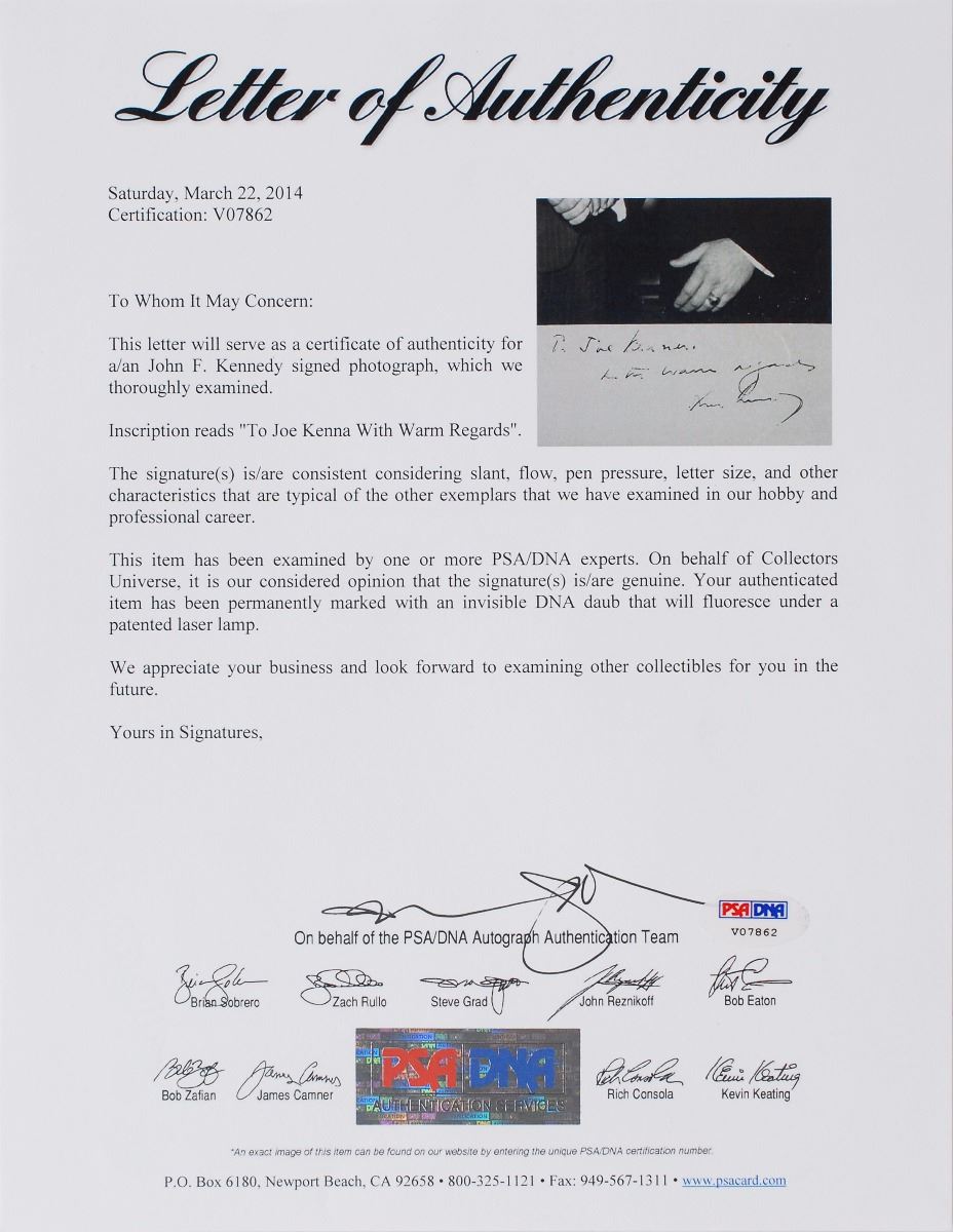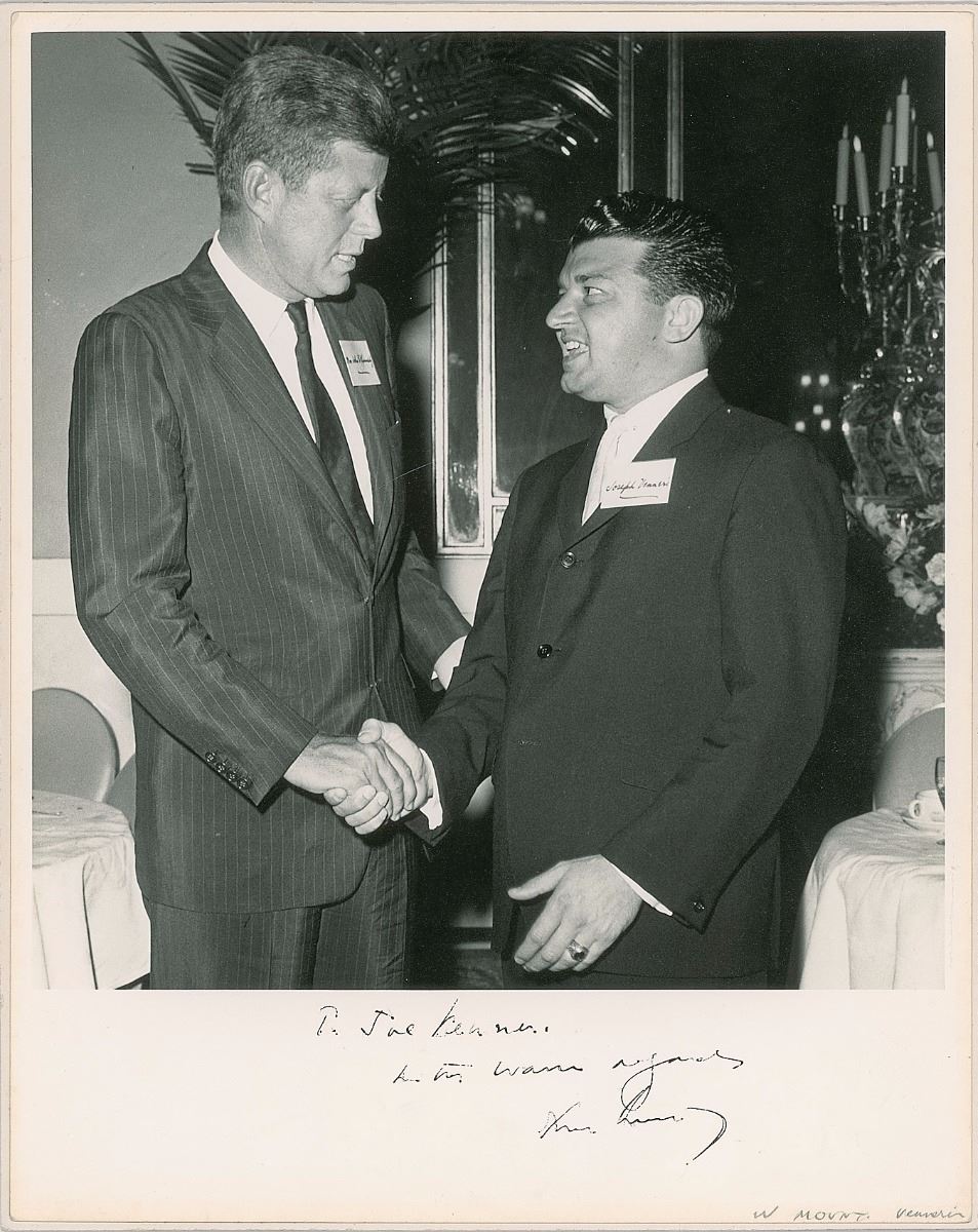 Vintage matte-finish 11 x 13.75 photo of Kennedy shaking hands with Joe Venneri at a function, with both gentlemen wearing name tags, signed and inscribed in the lower border in black ink, “To Joe Venneri, with warm regards, John F. Kennedy.” Photo is affixed to a slightly larger mount. In fine condition, with slight irregular ink adhesion to the signature and inscription. Accompanied by a full letter of authenticity from PSA/DNA. Venneri was a member of the musical group The Tokens, best known for their 1961 chart-topping single ‘The Lion Sleeps Tonight.’ A fabulous oversized photo with a unique musical association.