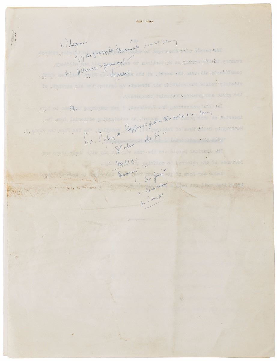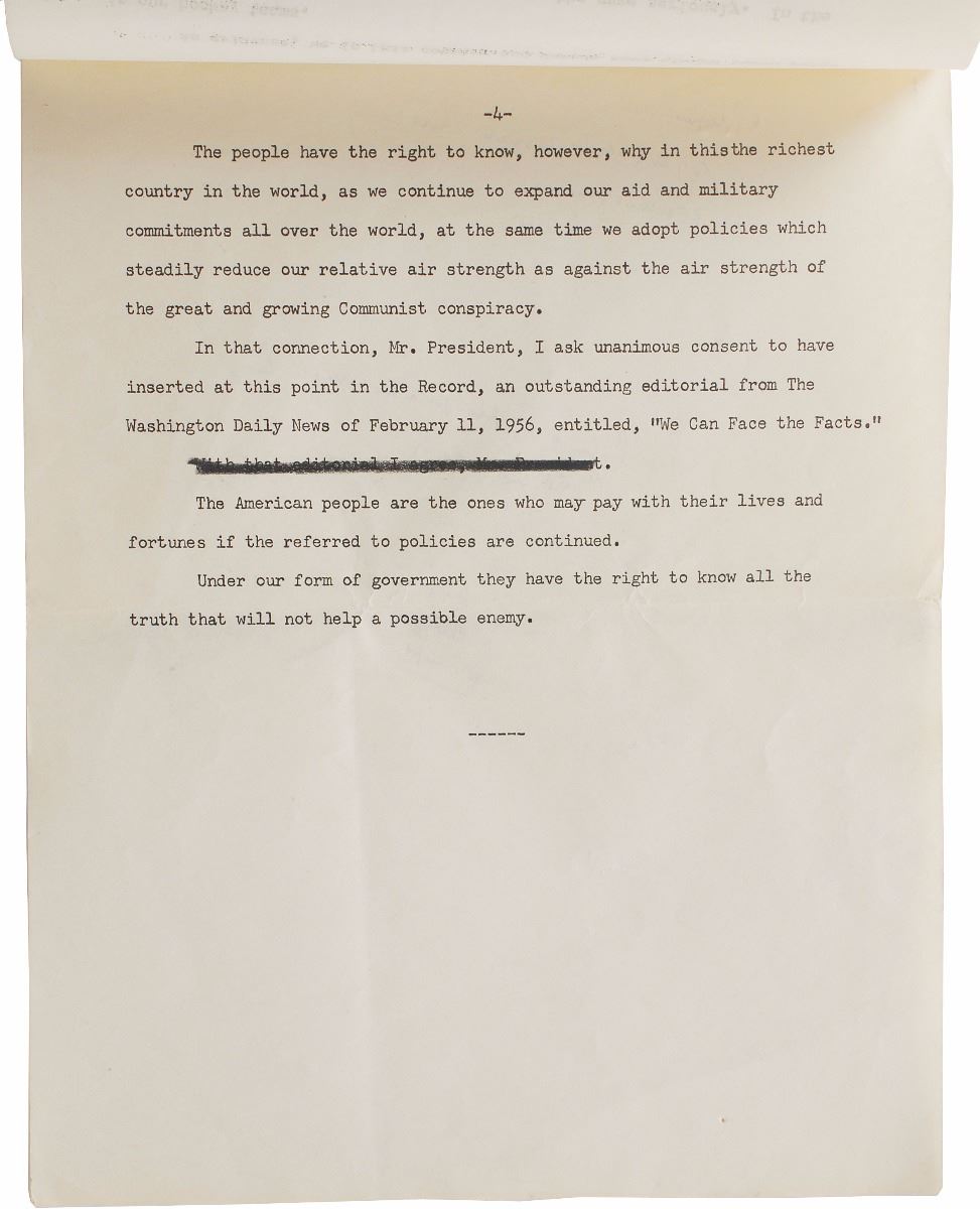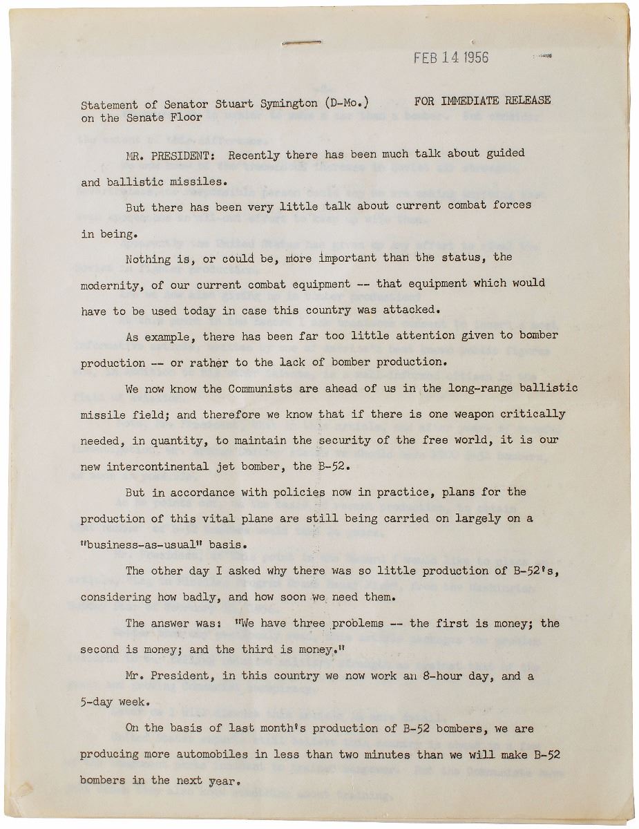 Unsigned handwritten notes on the reverse of the last page of a typescript, four pages, 8 x 10.5, stamp-dated February 14, 1956. Mimeographed statement of Senator Stuart Symington given on the Senate floor about military preparedness. In part: “Recently there has been much talk about guided missiles. But there has been very little talk about current combat forces in being…We now know the Communists are ahead of us in the long-range ballistic missile field; and therefore we know that if there is one weapon critically needed, in quantity, to maintain the security of the free world, it is our new intercontinental jet bomber the B-52.” Kennedy’s illegible notes are penned in ink on the reverse of the last page and consist of about twenty-five words. Also includes a similar typescript of remarks by Senator Kennedy at a town hall luncheon in Los Angeles, six pages, 8.5 x 14, April 13, 1956, with several lines struck through in ink. In very good condition, with toning and soiling.