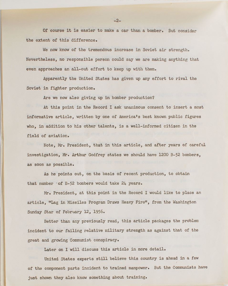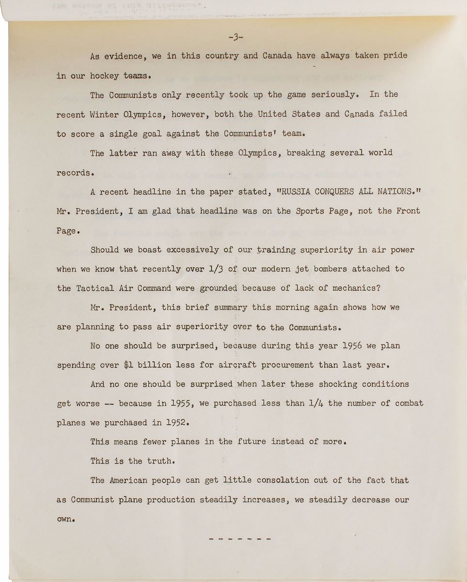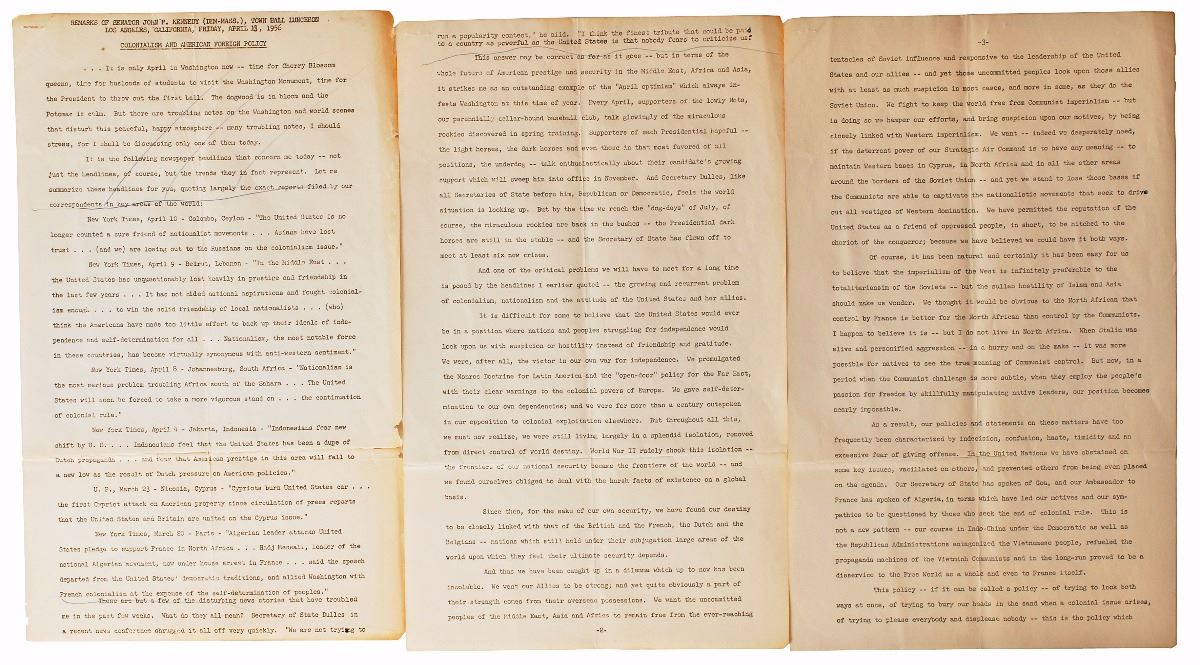 Unsigned handwritten notes on the reverse of the last page of a typescript, four pages, 8 x 10.5, stamp-dated February 14, 1956. Mimeographed statement of Senator Stuart Symington given on the Senate floor about military preparedness. In part: “Recently there has been much talk about guided missiles. But there has been very little talk about current combat forces in being…We now know the Communists are ahead of us in the long-range ballistic missile field; and therefore we know that if there is one weapon critically needed, in quantity, to maintain the security of the free world, it is our new intercontinental jet bomber the B-52.” Kennedy’s illegible notes are penned in ink on the reverse of the last page and consist of about twenty-five words. Also includes a similar typescript of remarks by Senator Kennedy at a town hall luncheon in Los Angeles, six pages, 8.5 x 14, April 13, 1956, with several lines struck through in ink. In very good condition, with toning and soiling.