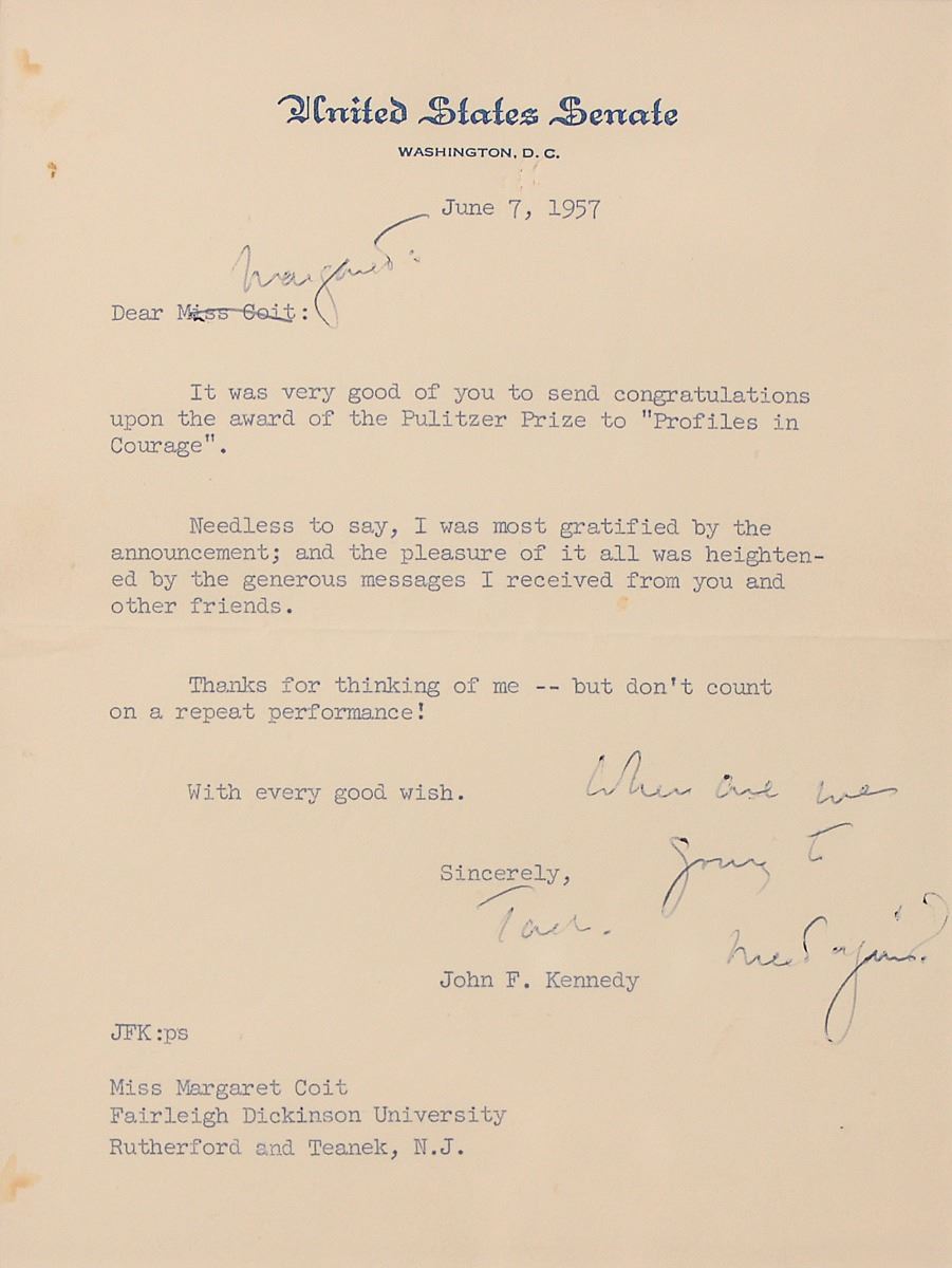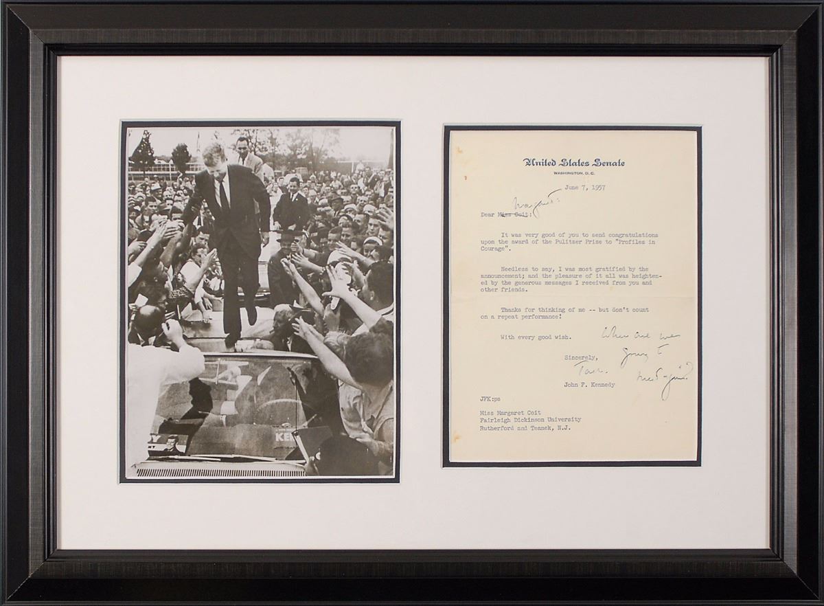 TLS signed “Jack,” one page, 6.25 x 8, United States Senate letterhead, June 7, 1957. Letter to Margaret Coit at Farleigh Dickinson University, in full: “It was very good of you to send congratulations upon the award of the Pulitzer Prize to ‘Profiles in Courage.’ Needless to say, I was most gratified by the announcement; and the pleasure of it all was heightened by the generous messages I received from you and other friends. Thanks for thinking of me—but don’t count on a repeat performance!” Kennedy adds a brief handwritten postscript, “When are we going to meet again?,” and crosses out the formal greeting to read “Margaret.” Double-matted and framed with a photo of Kennedy surrounded by an adoring crowd to an overall size of 20.5 x 15. In fine condition, with a few small light stains to left edge. Accompanied by a full letter of authenticity from PSA/DNA.