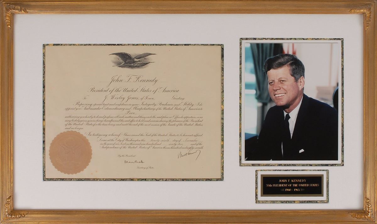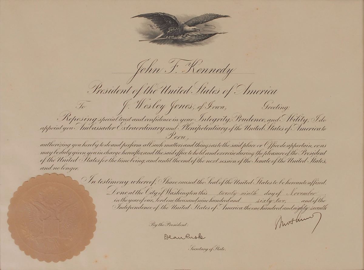 Partly-printed DS as president, one page, 15 x 11.25, November 29, 1962. President Kennedy appoints J. Wesley Jones, of Iowa, as “Ambassador Extraordinary and Plenipotentiary of the United States of America to Peru.” Signed at the conclusion by Kennedy, and countersigned by Dean Rusk as the secretary of state. Embossed tan paper seal affixed to lower left remains fully intact. Archivally cloth-matted and framed with a handsome portrait of Kennedy and an engraved nameplate to an overall size of 32.5 x 19.25. In fine condition. In an effort stave off communism in Latin America, Kennedy’s Alliance for Progress initiative organized aid programs and social reforms that would send both financial and agricultural support to many Latin American states. The subsequent creation of the Peace Corps would likewise send waves of young teachers and community builders to assist in the development. John Wesley Jones worked for over 42 years in the Foreign Service, most notably as an ambassador to Libya and Peru. Kennedy likely selected Jones due to the latter’s experience as a stationed political officer in communist China. His position in Lima would ultimately be his last foreign assignment. Oversized.