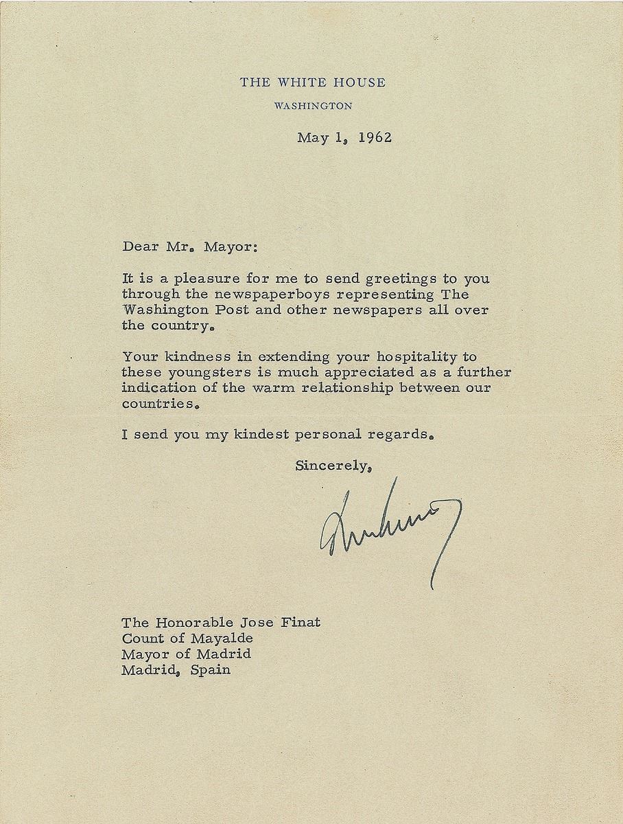 TLS as president signed “John Kennedy,” one page, 6.75 x 8.75, White House letterhead, May 1, 1962. Letter to the mayor of Madrid, Spain, Jose Finat, in full: “It is a pleasure for me to send greetings to you through the newspaper boys representing The Washington Post and other newspapers all over the country. Your kindness in extending your hospitality to these youngsters is much appreciated as a further indication of the warm relationship between our countries. I send you my kindest personal regards.” In fine condition, with old mounting adhesive on reverse, not affecting overall appearance.