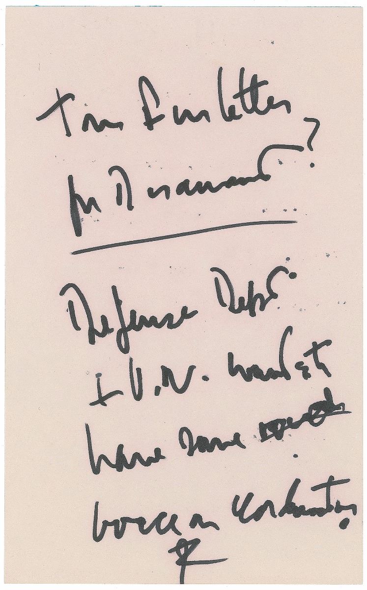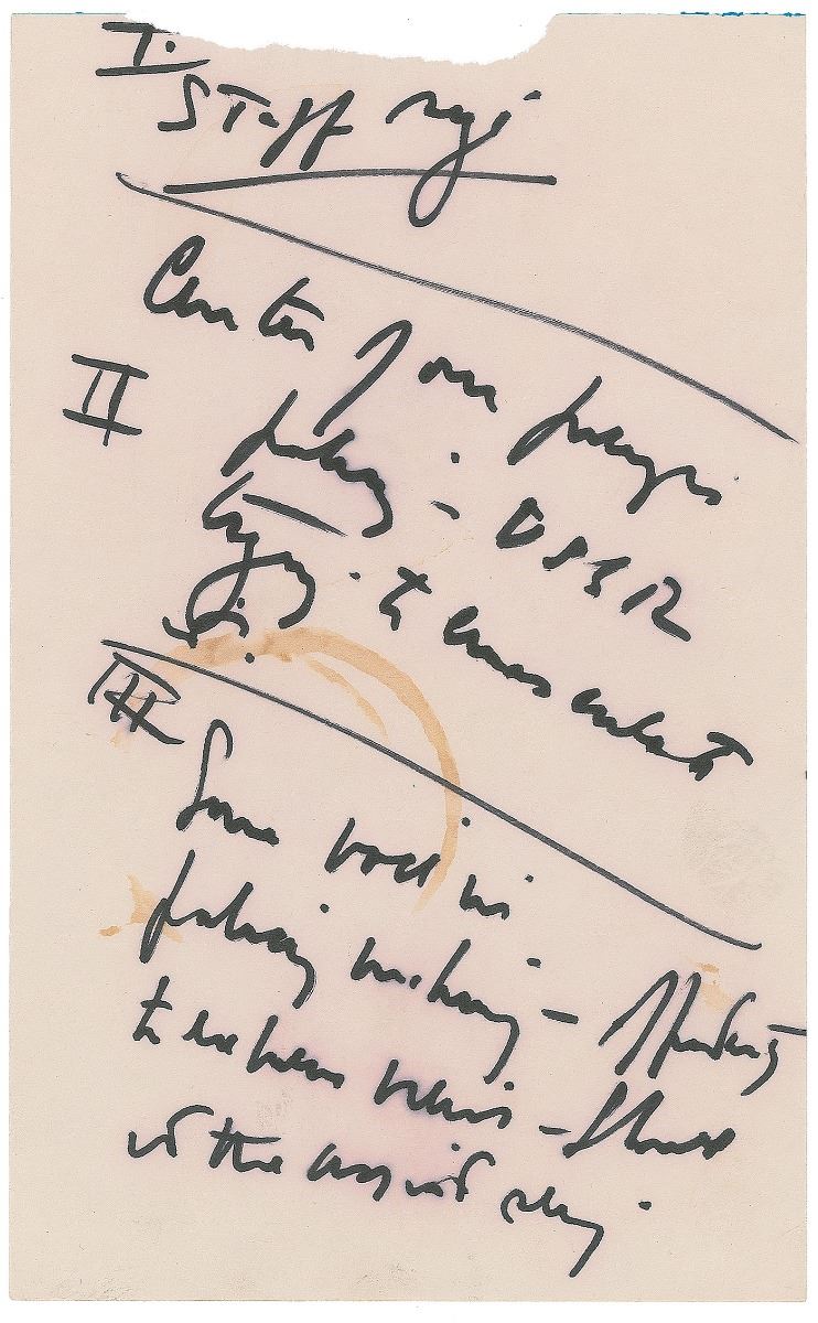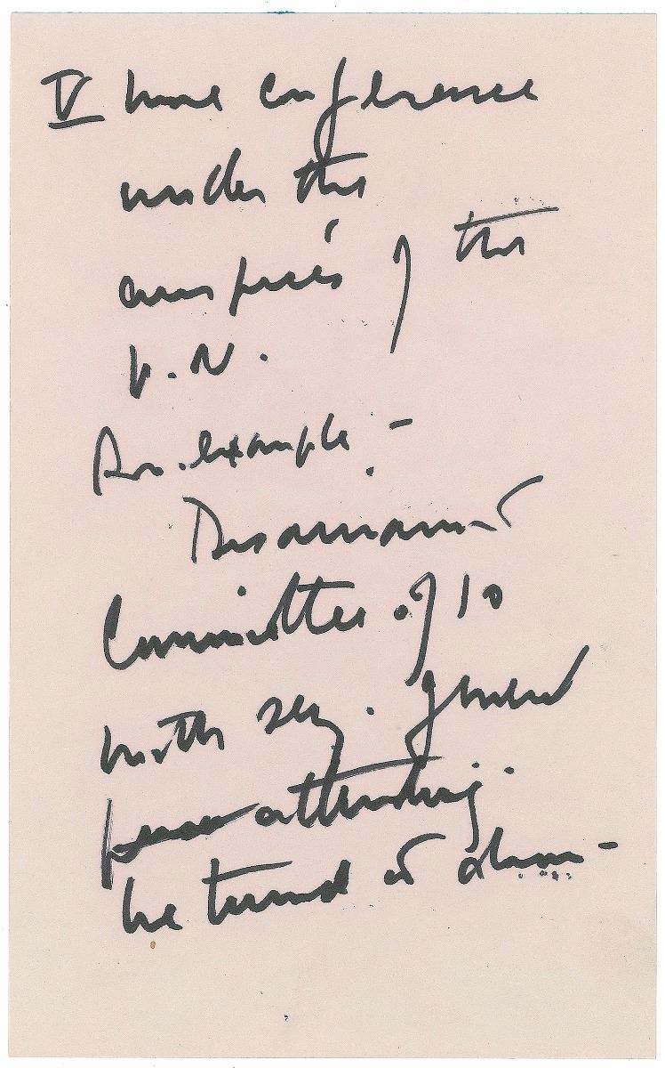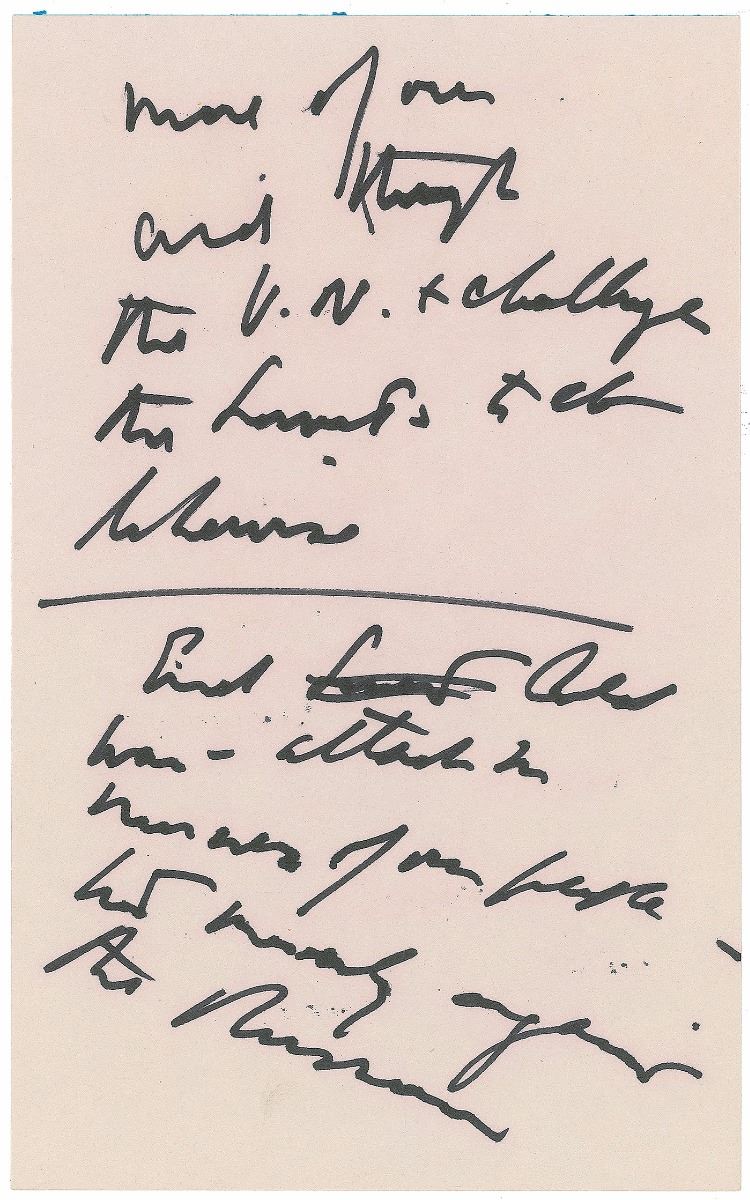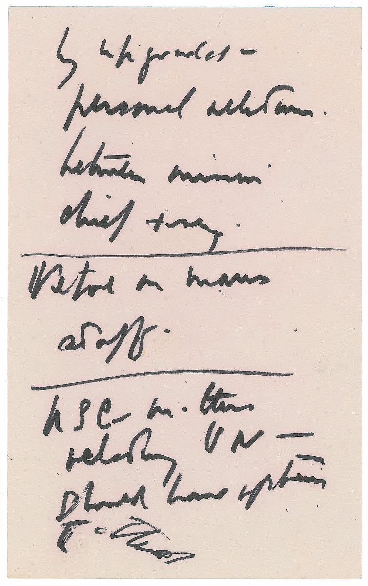 Kennedy’s handwritten notes on a meeting related to the Cold War, six pages, 5 x 8, no date but likely as president circa 1961–1962. Brief notes written by Kennedy on a number of topics, nearly all related to foreign policy, the Soviet Union, and United Nations, with a selection of lines reading: “Center of our foreign policy—USSR trying to emasculate it”; “Some voice in policy making—opportunity to express views—show it the right way”; “Want to express views on making of policy”; “Personal relations between mission chief & secy”; “Veto on main staff”; “USC—matters relating UN”; “Have conference under the auspices of the U. N. For example—Disarmament Committee of 10 with secy. general attending, he turned it down”; “More of our aid through the U. N. & challenge the Soviets to do likewise”; “End Cold War—attack in numbers of our people—but mainly against the Russians“; “Tom Finletter for Disarmament?”; and “Defense Dept. & U. N. want to have some voice in coordination.” In fine condition, with a light coffee cup stain to the first page.