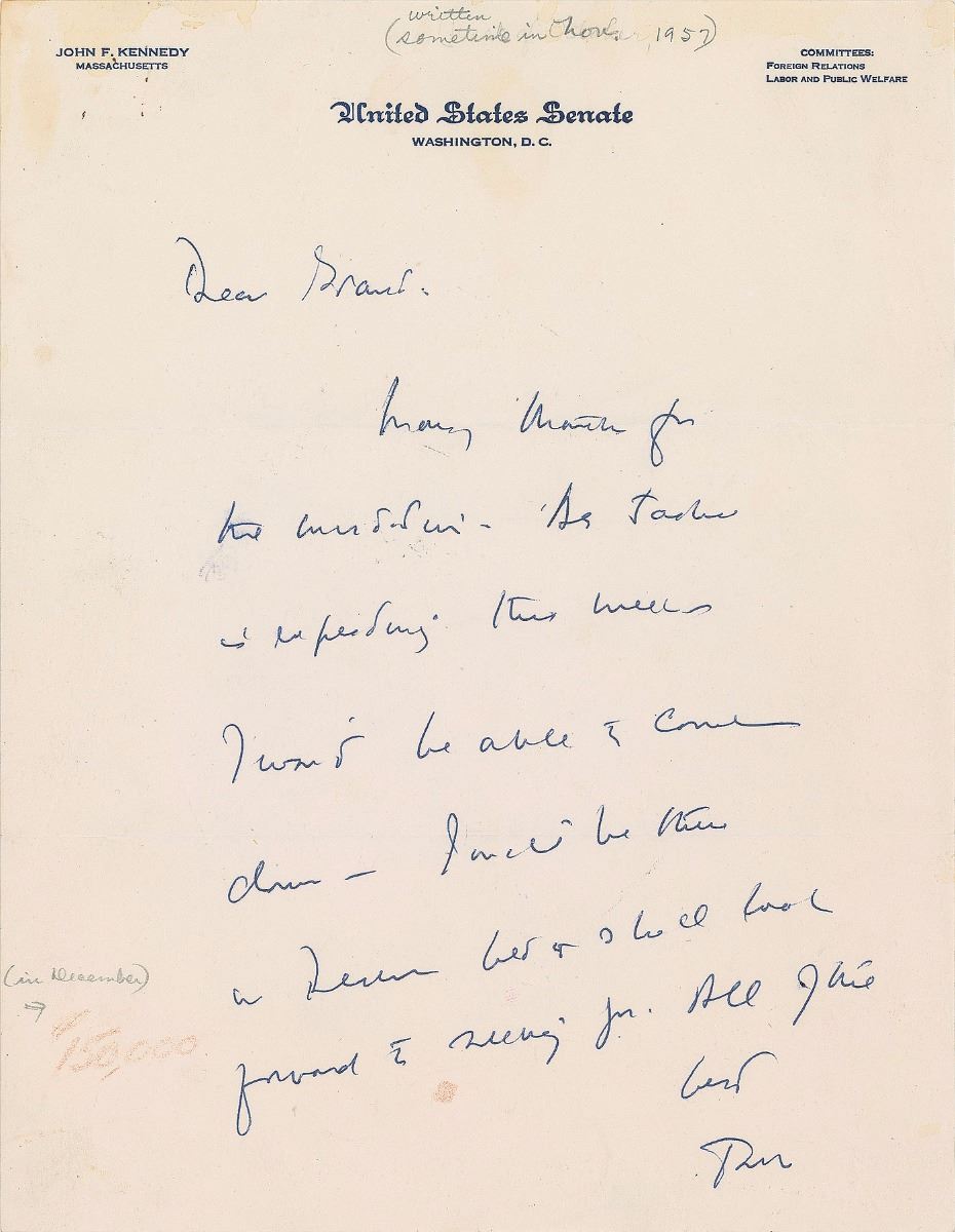 Exceptional ALS signed “John,” one page, 8 x 10.5, United States Senate letterhead, no date but circa November 1957. In full: “Many thanks for the invitation. As Jackie is expecting this week I won’t be able to come down—I will be there in December & I will look forward to seeing you.” In very good to fine condition, with scattered creasing and a few light stains. Jackie gave birth to Caroline, their first daughter, on November 27, 1957, amidst JFK’s busy reelection campaign. This was an especially joyous occasion as the couple had suffered a stillborn daughter the year prior in an early instance of the ‘Kennedy curse.’ With such intimate personal content, this is an immensely desirable autograph letter by the father-to-be.