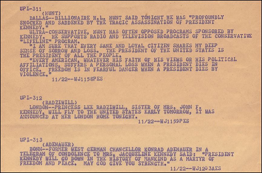 Original bulletin section of United Press International (UPI) teletype, 8.5 x 5.75, listing reactions to the breaking news of President John F. Kennedy’s assassination in Dallas, Texas, on November 22, 1963 at 11:59 PM EST. The listed reactions include Texas conservative billionaire H. L. Hunt, First Lady Jackie Kennedy’s sister Lee Radziwill, and German chancellor Konrad Adenauer. In fine condition.