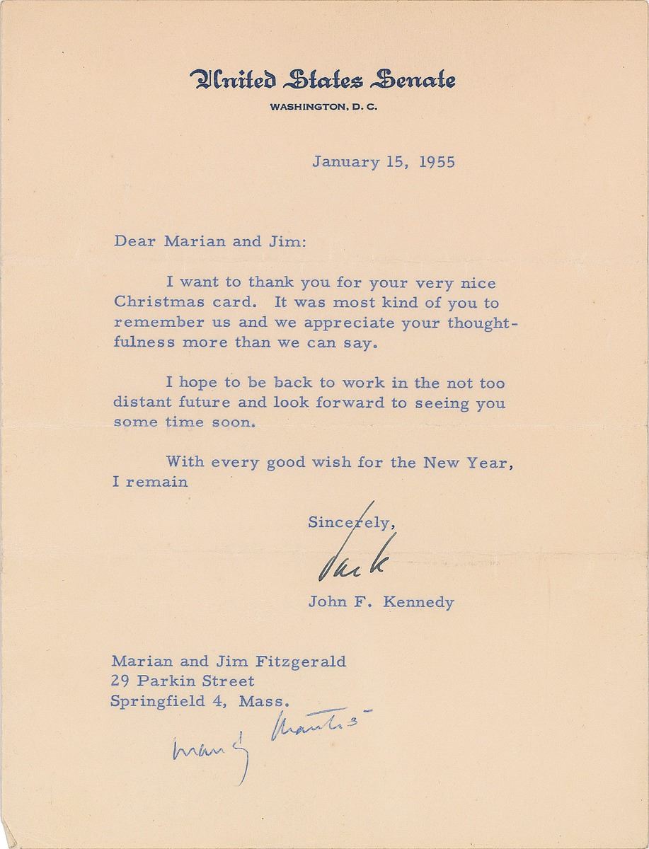 TLS signed “Jack,” one page, 6.25 x 8, United States Senate letterhead, January 15, 1955. Letter to Marian and Jim Fitzgerald, in full: “I want to thank you for your very nice Christmas card. It was most kind of you to remember us and we appreciate your thoughtfulness more than we can say. I hope to be back to work in the not too distant future and look forward to seeing you some time soon. With every good wish for the New Year, I remain.” Kennedy adds at the bottom in his own hand, “Many thanks.” In very good to fine condition, with several horizontal folds.