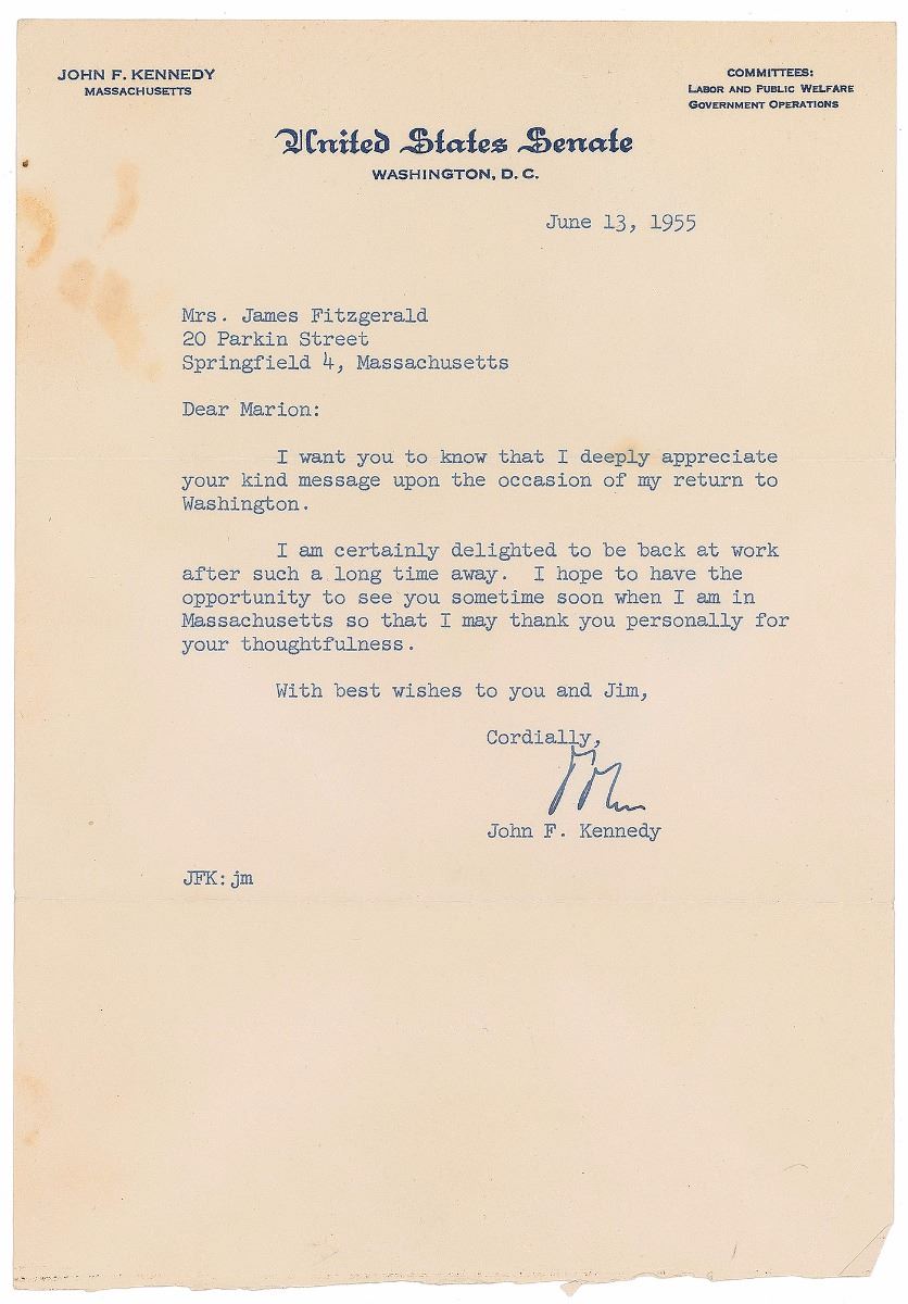 TLS signed “John,” one page, 6.25 x 9, United States Senate letterhead, June 13, 1955. Letter to Marian Fitzgerald, in full: “I want you to know that I deeply appreciate your kind message upon the occasion of my return to Washington. I am certainly delighted to be back at work after such a long time away. I hope to have the opportunity to see you sometime soon when I am in Massachusetts so that I may thank you personally for your thoughtfulness. With best wishes to you and Jim.” In very good to fine condition, with light staining in the left margin.