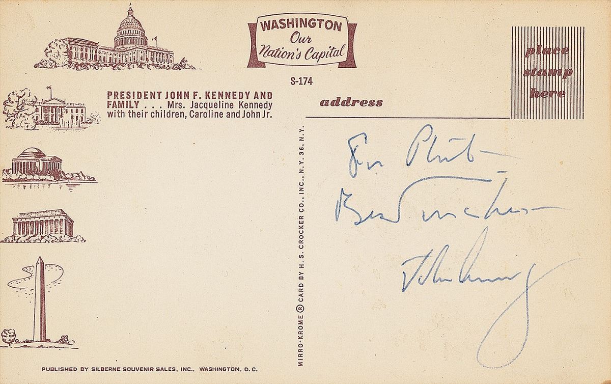 Ballpoint signature and inscription, "For Phil—Best wishes—John Kennedy,” on the reverse of a 5.5 x 3.5 postcard depicting Kennedy, Jacqueline, and their children Caroline and John, Jr. Subtle toning, and very faint vertical bend touching first name, otherwise fine condition. Pre-certified PSA/DNA.
