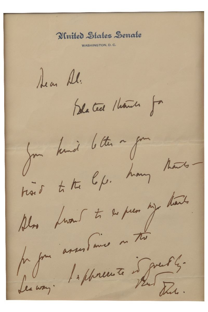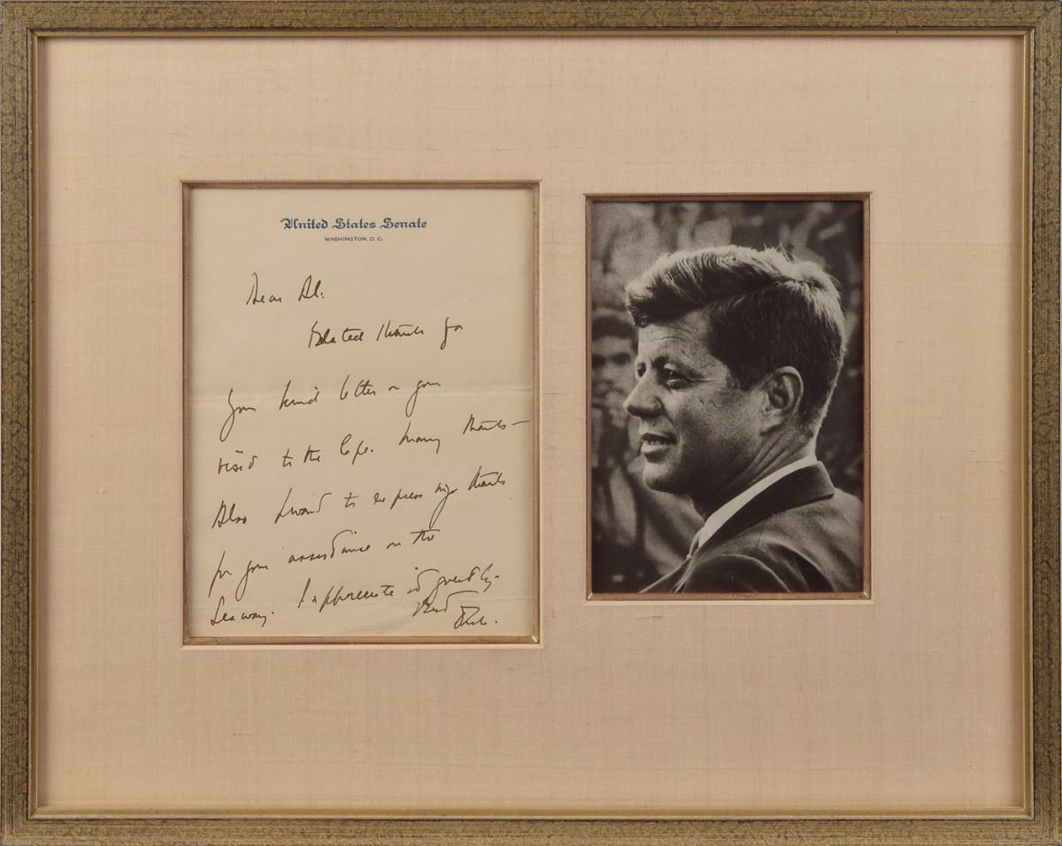 ALS signed “Jack,” one page, 6 x 7.75, United States Senate letterhead, no date. Letter to "Al," in full: "Belated thanks for your kind letter on your visit to the Cape. Many thanks. Also I was to express my thanks for your assistance on the Seaway. I appreciate it greatly." Handsomely cloth-matted and framed with a portrait to an overall size of 18.5 x 14.5. In fine condition.