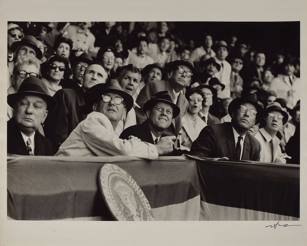 Spectacular semi-glossy 20 x 16 silver gelatin photo of President John F. Kennedy and Vice President Lyndon B. Johnson at the Washington Senators' home opener in 1961, signed in the lower right by the photographer, Neil Leifer. In fine condition, with light soiling to lower left corner.