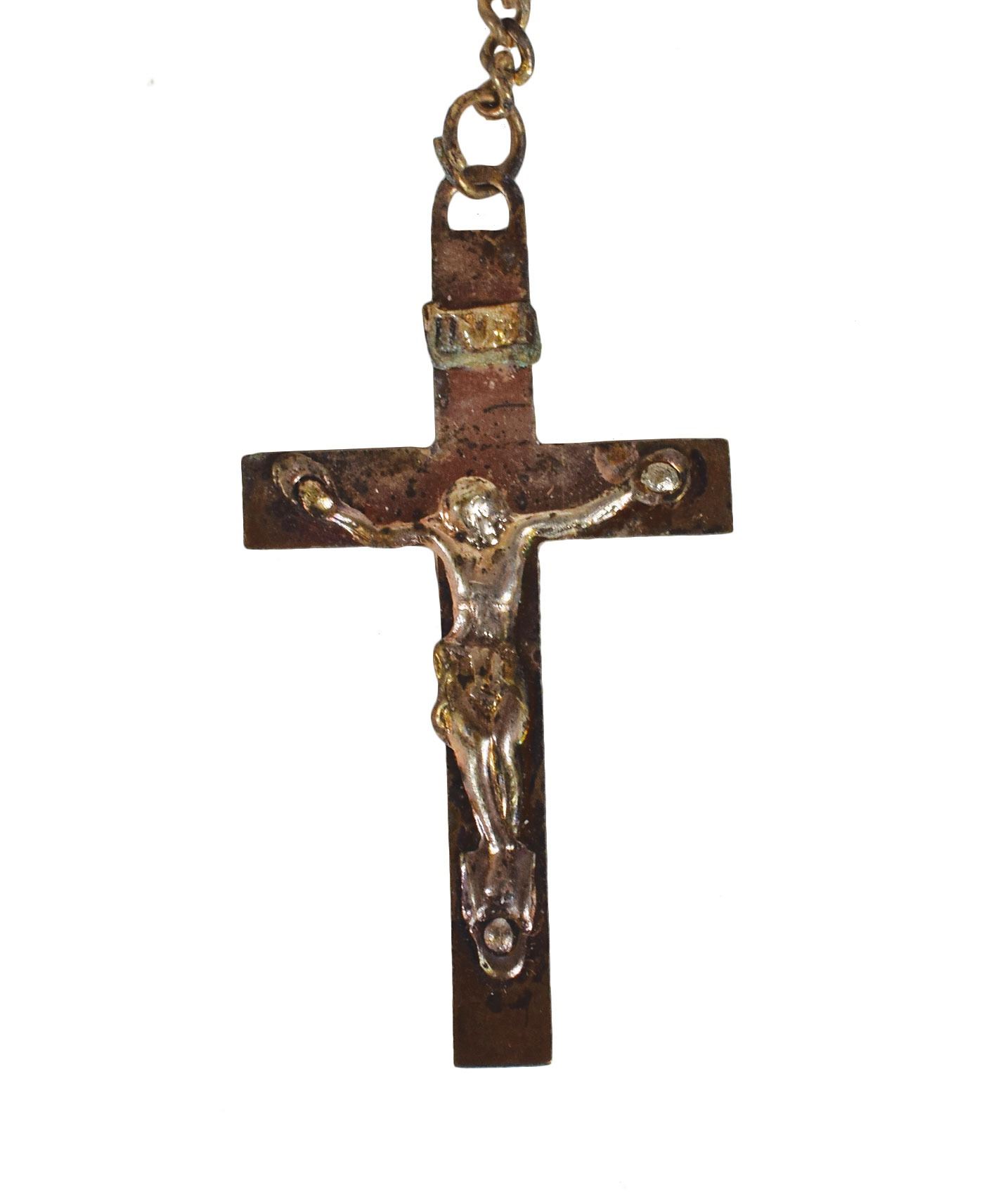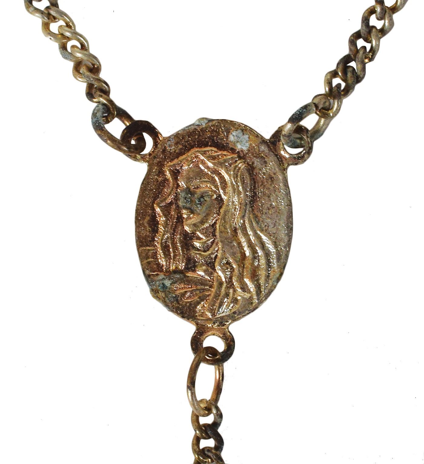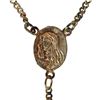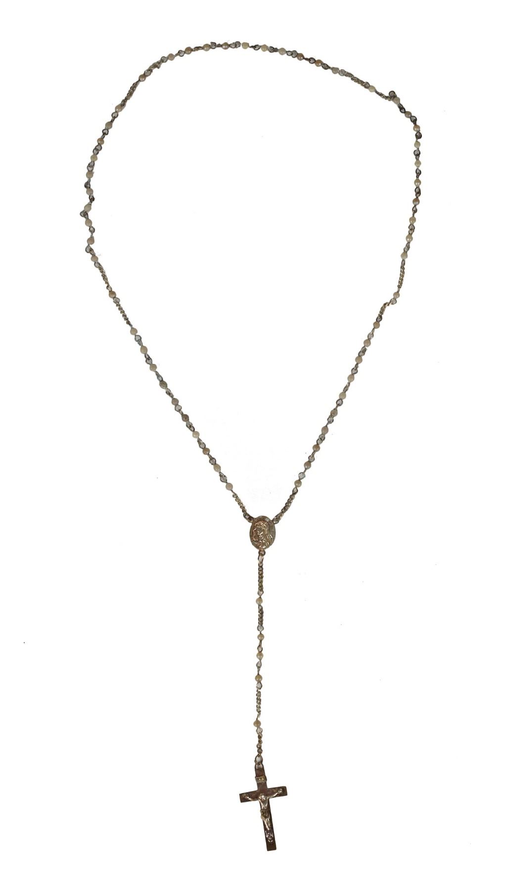 Exquisite Rosary bead necklace gifted to President-elect John F. Kennedy and Jacqueline Kennedy upon the birth of their son John F. Kennedy, Jr., on November 25, 1960. Consisting of numerous small beads and links, the necklace measures approximately 16.25? in length, and features a small Mary and Sacred Heart medallion and cross. Includes the original gold metallic sequined pouch with front snap enclosure. In fine condition, with some toning and oxidizing to metal. Accompanied by a letter of provenance from Mary Barelli Gallagher, the secretary to Senator John F. Kennedy and then later to First Lady Jackie Kennedy, in part: "This baby gift is one of the many gifts that had arrived daily to the home of President–Elect and Mrs. John F. Kennedy, 3307 N St. N. W., Georgetown, Washington, D.C. on the occasion of John Jr.'s Birth…Mrs. Kennedy would ask that I prepare a letter of thanks to the sender for her to sign, and this is one of the gifts that she offered me to take home. I donated the vast majority of these gifts to various charities, others I gave away to friends, relatives, etc., keeping the more interesting ones, such as this, for myself."