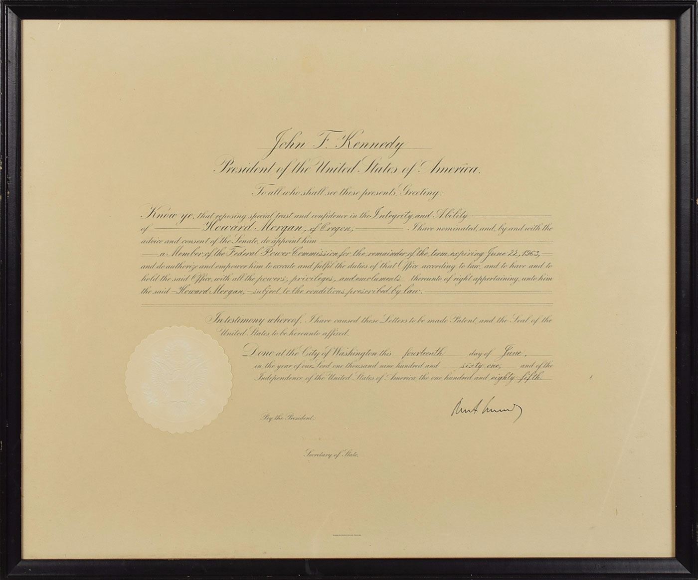 Partly-printed DS as president, one page, 22.5 x 18.5, June 14, 1961. President Kennedy appoints Howard Morgan of Oregon as "a Member of the Federal Power Commission, for the remainder of the term expiring June 22, 1963." Signed at the conclusion by Kennedy, and countersigned by Secretary of State Dean Rusk. White wafer seal remains affixed to lower left. Framed and in fine condition. Accompanied by a framed 1963 Leland Olds Award certificate issued to Howard Morgan "as a member of the Federal Power Commission for the years 1961–1963."