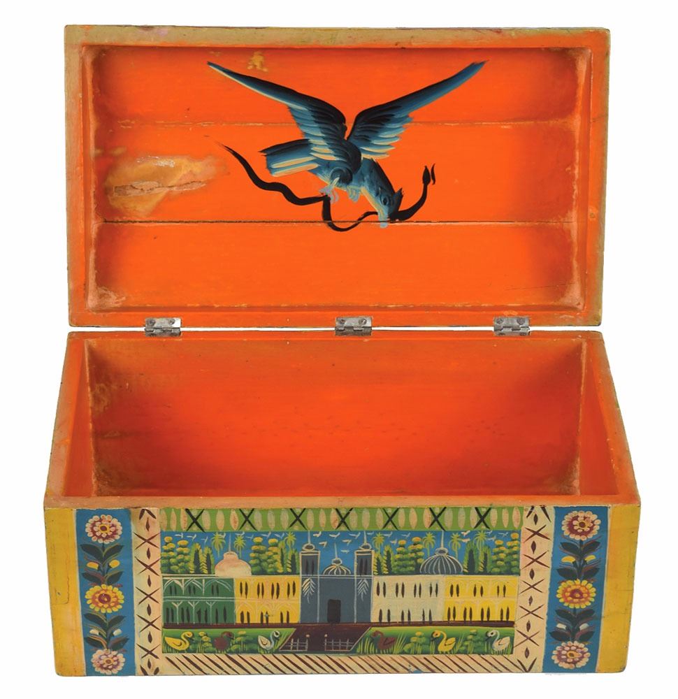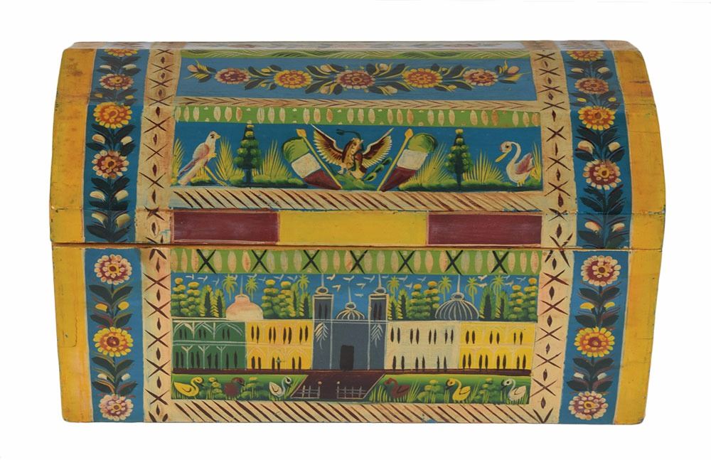 Ornate hand-painted wooden folk art chest, measuring 10 x 5.25 x 5.5, gifted by President and Mrs. Kennedy to Caroline Kennedy's dance teacher in 1963. The artwork depicts the Zocalo in Mexico City, an eagle flanked by Mexican flags, and other flora and fauna of Mexico. The bottom is stamped "Mexico" and bears an affixed label reading, "Gift from Pres. & Mrs. Kennedy to Mrs. Smith. Caroline Dance Teacher, 1963." In very good to fine condition. Provenance: The Robert L. White Collection, lot 205, Guernsey's, 1998.