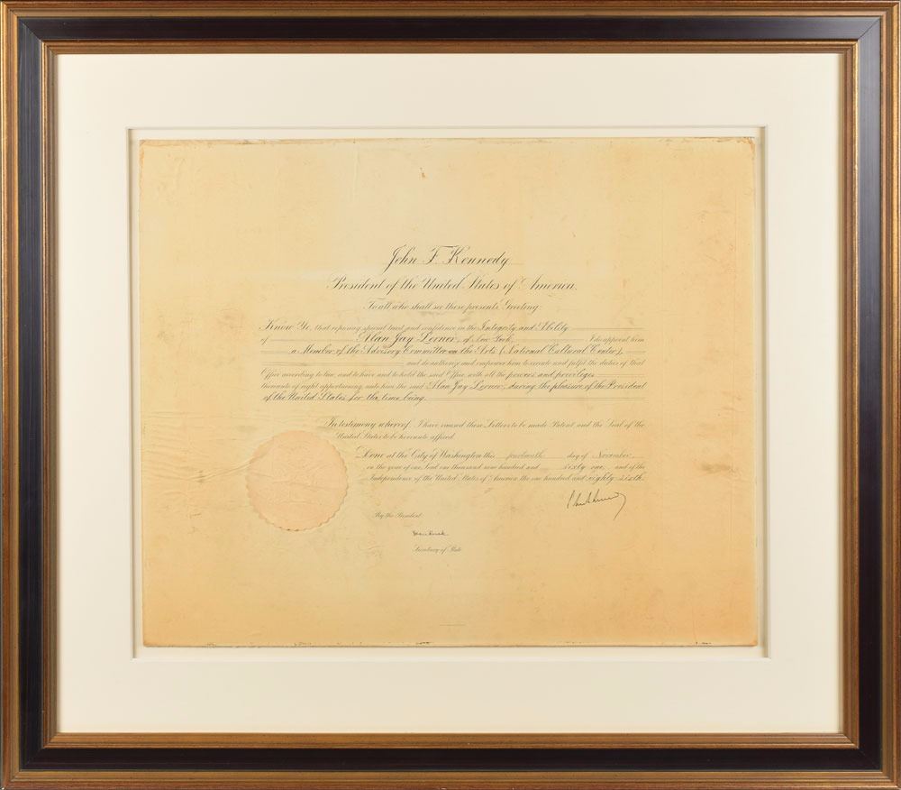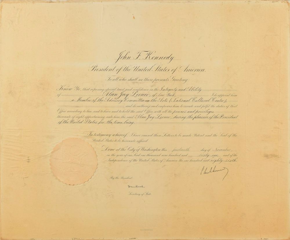 Important partly-printed DS as president, one page, 22.75 x 18.75, November 14, 1961. President Kennedy appoints renowned lyricist Alan Jay Lerner as "a Member of the Advisory Committee on the Arts (National Cultural Center)." Boldly signed at the conclusion by President Kennedy and countersigned by Secretary of State Dean Rusk. The embossed white paper seal affixed to the lower left remains fully intact. Archivally mounted, matted, and framed to an overall size of 33 x 29. In very good condition, with areas of light staining and toning, and creasing and rippling from being permanently affixed to a same-size mount; both signatures remain quite bold. Accompanied by full letters of authenticity from PSA/DNA and JSA.
