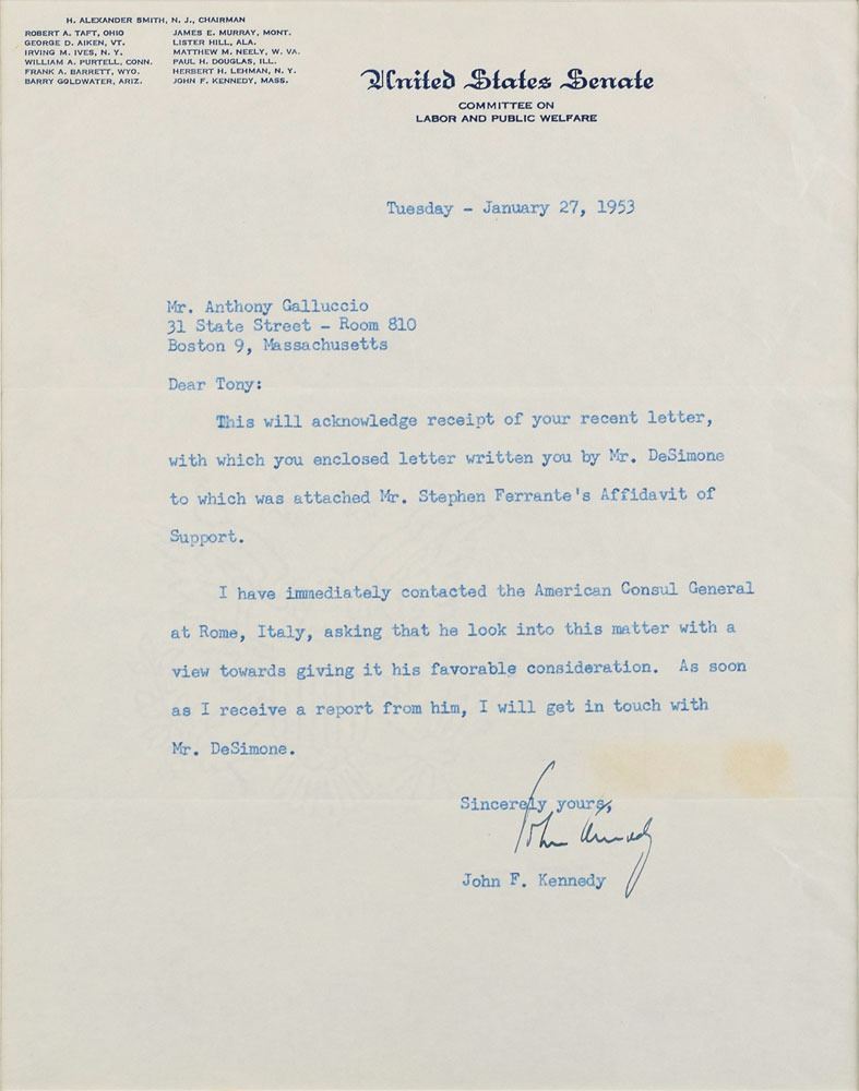 TLS signed “John Kennedy,” one page, 7.5 x 9.5, United States Senate, Committee on Labor and Public Welfare letterhead, January 27, 1953. Letter to Anthony Galluccio, in full: "This will acknowledge receipt of your recent letter, with which you enclosed letter written you by Mr. DeSimone to which was attached Mr. Stephen Ferrante's Affidavit of Support. I have immediately contacted the American Consul General at Rome, Italy, asking that he look into this matter with a view towards giving it his favorable consideration. As soon as I receive a report from him, I will get in touch with Mr. DeSimone." Matted to an overall size of 11.75 x 16.5. In fine condition, with scattered light creasing and an area of light toning above the signature.