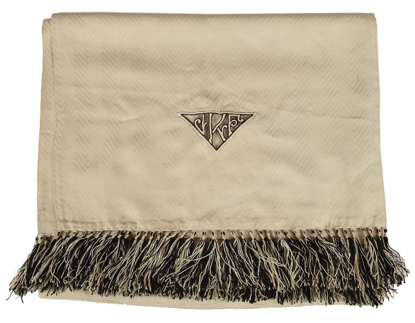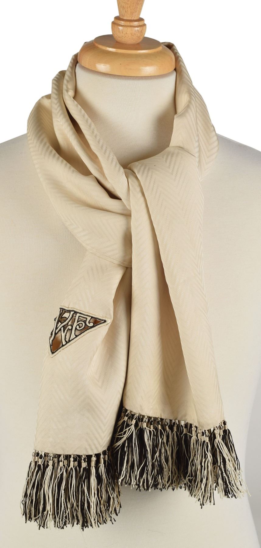 John F. Kennedy’s personally owned cream-colored silk scarf from A. Sulka & Company, worn by Kennedy during his tenure as a congressman and into his early senatorial career, measuring approximately 53.5 x 15.5, with attractive herringbone pattern, classic black-and-tan fringe ends, and an embroidered open monogram bearing Kennedy’s initials, “JFK.” In fine condition, with a couple trivial dark marks. Provenance: Robert White Collection, Guernsey’s, 1998. The Sulka brand became synonymous with the style of the upper crust and political elite, and long served as the go-to haberdashery for the likes of the Duke of Windsor, Winston Churchill, Henry Ford, and Clark Gable, amongst others. An accouterment of his classic style, this is an exquisite scarf sported by Kennedy as he strolled the chilly sidewalks of Boston during the early 1950s.