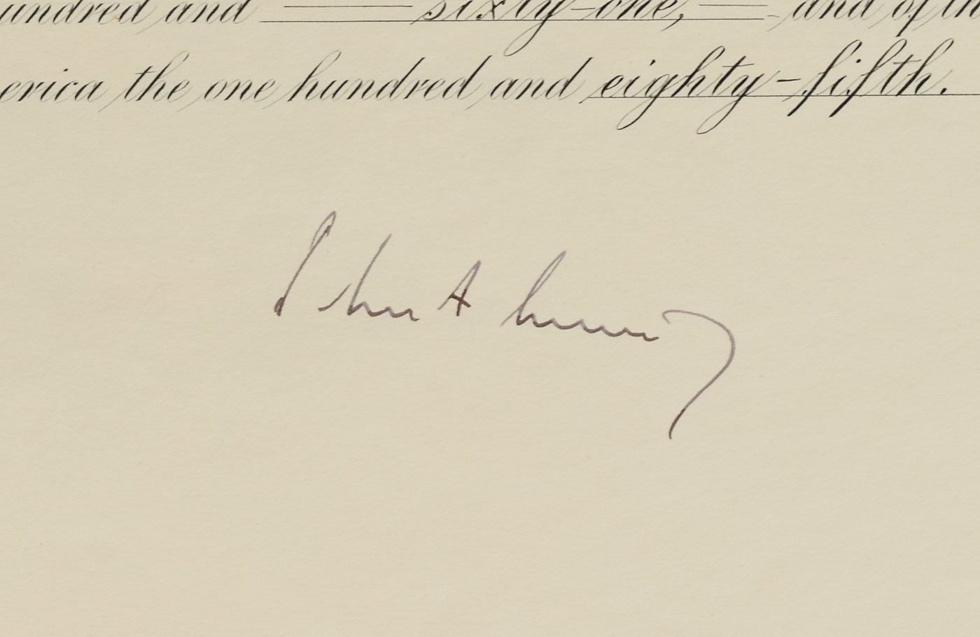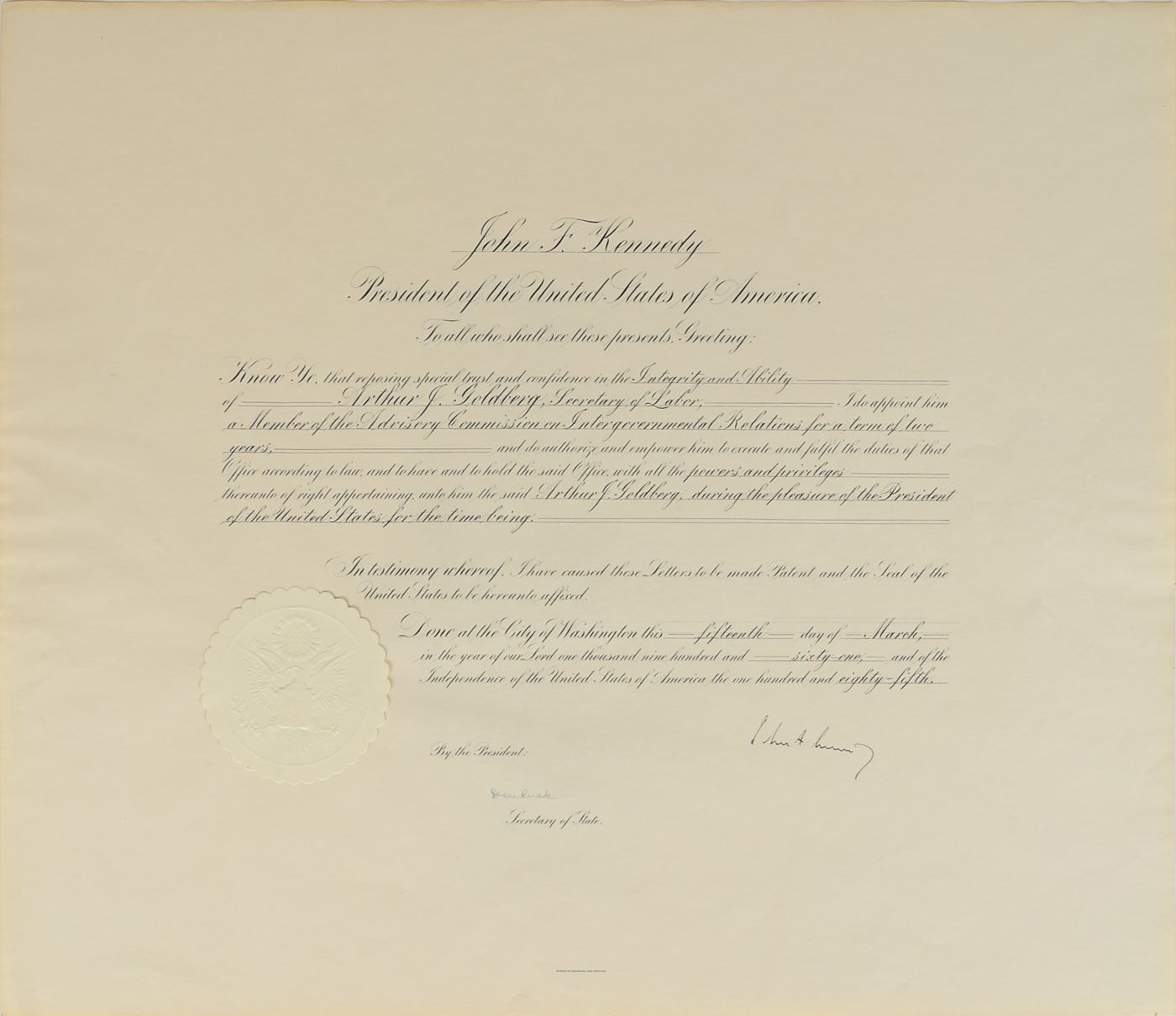 Partly-printed DS as president, one page, 23 x 19, March 15, 1961. President Kennedy appoints "Arthur J. Goldberg, Secretary of Labor…a Member of the Advisory Commission on Intergovernmental Relations for a term of two years." Neatly signed at the conclusion by President Kennedy and countersigned by Secretary of State Dean Rusk. The embossed white paper seal affixed to the lower left remains fully intact. In fine condition. The following year, Kennedy would appoint Goldberg to an even larger role—Associate Justice of the United States Supreme Court. Goldberg would serve on the Court from September 28, 1962 to July 26, 1965, where his liberal views shifted the Court's balance toward a broader construction of constitutional rights.