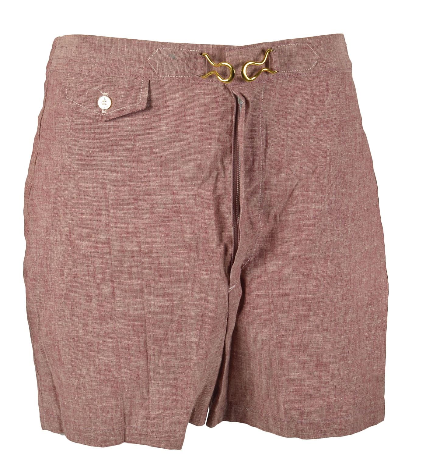 John F. Kennedy's personally-owned brick-red polyester swimming trunks, featuring a gold-tone dual metal clasp on the front, small right pocket with a button-secured flap, and zippered fly. Inside the waistband are a size tag, "M," retailer's tag, "Puritan Cricket Shop, Hyannis," and manufacturer's label, "Deckand Denim." In fine condition. These trunks originate from the estate of Lieutenant Henry E. Hirschy, Jr., and are accompanied by a letter of provenance from Priscilla Hirschy, describing Lt. Hirschy's role in the Kennedy administration: "Lieutenant Hirschy was sent to the White House early in the Kennedy Administration. He was assigned as the Supply Officer to the Naval Aide to the President and served as the Director of the Executive Dining Facility, sometimes called The Navy Mess in the White House. In addition to these duties, Lt. Hirschy was responsible for Supply and logistic support for the President, including food, lodging, and other personal services as Camp David and in the Presidential Yachts. Diromg trips away from Washington, Lt. Hirschy was responsible for staffing and operation of the President's quarters. This included planning, preparing and serving state dinners." Also includes Lt. Hirschy's original 1962 "White House Staff" badge for the U.S. Naval Base at Newport, Rhode Island. Included as well is an image of Kennedy wearing this style of swimming trunks.