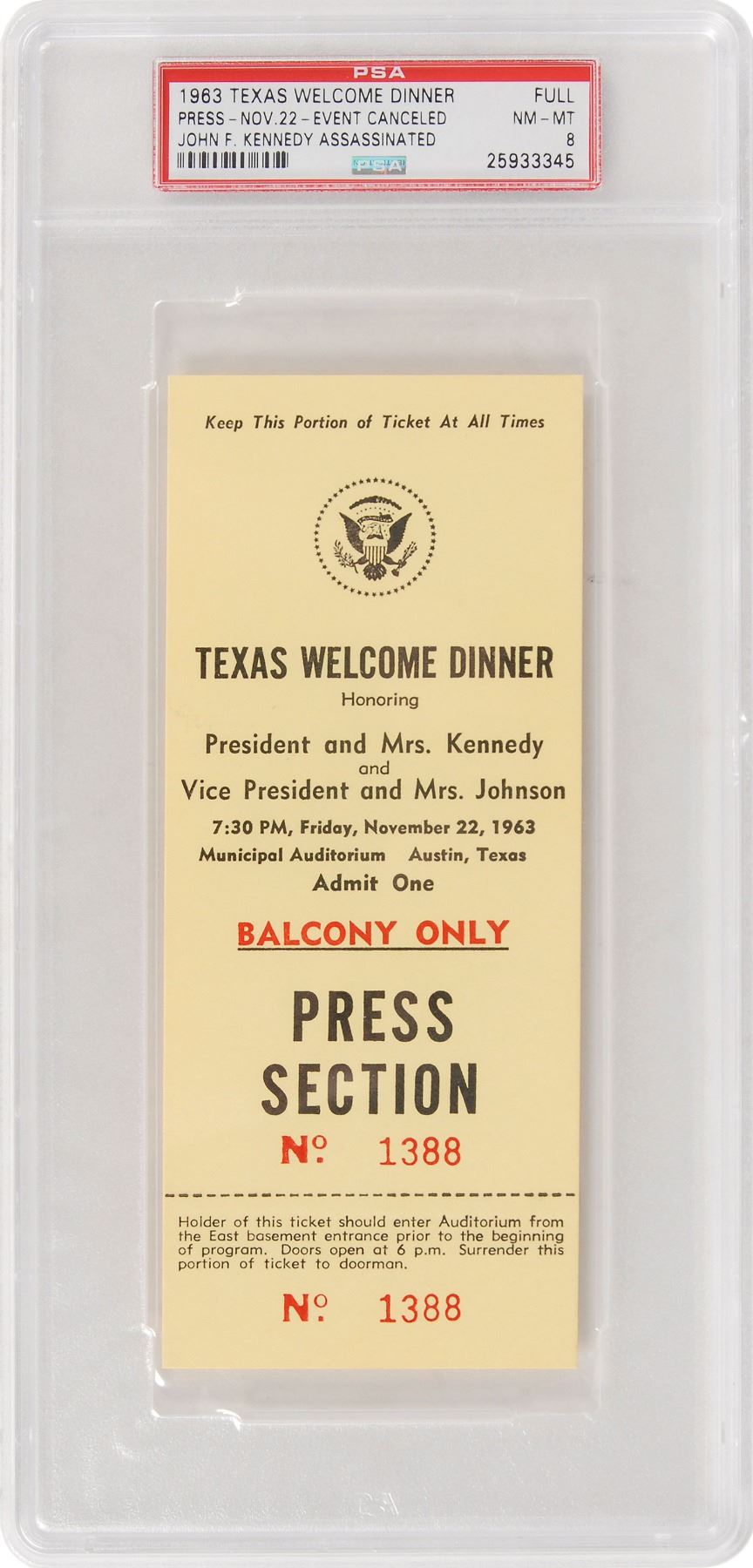 Unused original "Press Section, Balcony Only" ticket, number 1388, 2.5 x 6, to the 'Texas Welcome Dinner' presented in honor of President John F. Kennedy and Vice President Lyndon B. Johnson, to be held at the Municipal Auditorium in Austin at 7:30 PM on November 22, 1963. Encapsulated in a plastic PSA/DNA authentication and grading holder, evaluating the ticket as "NM-MT 8." In fine condition. Scheduled to occur on the night of Kennedy's assassination, this dinner would never take place.