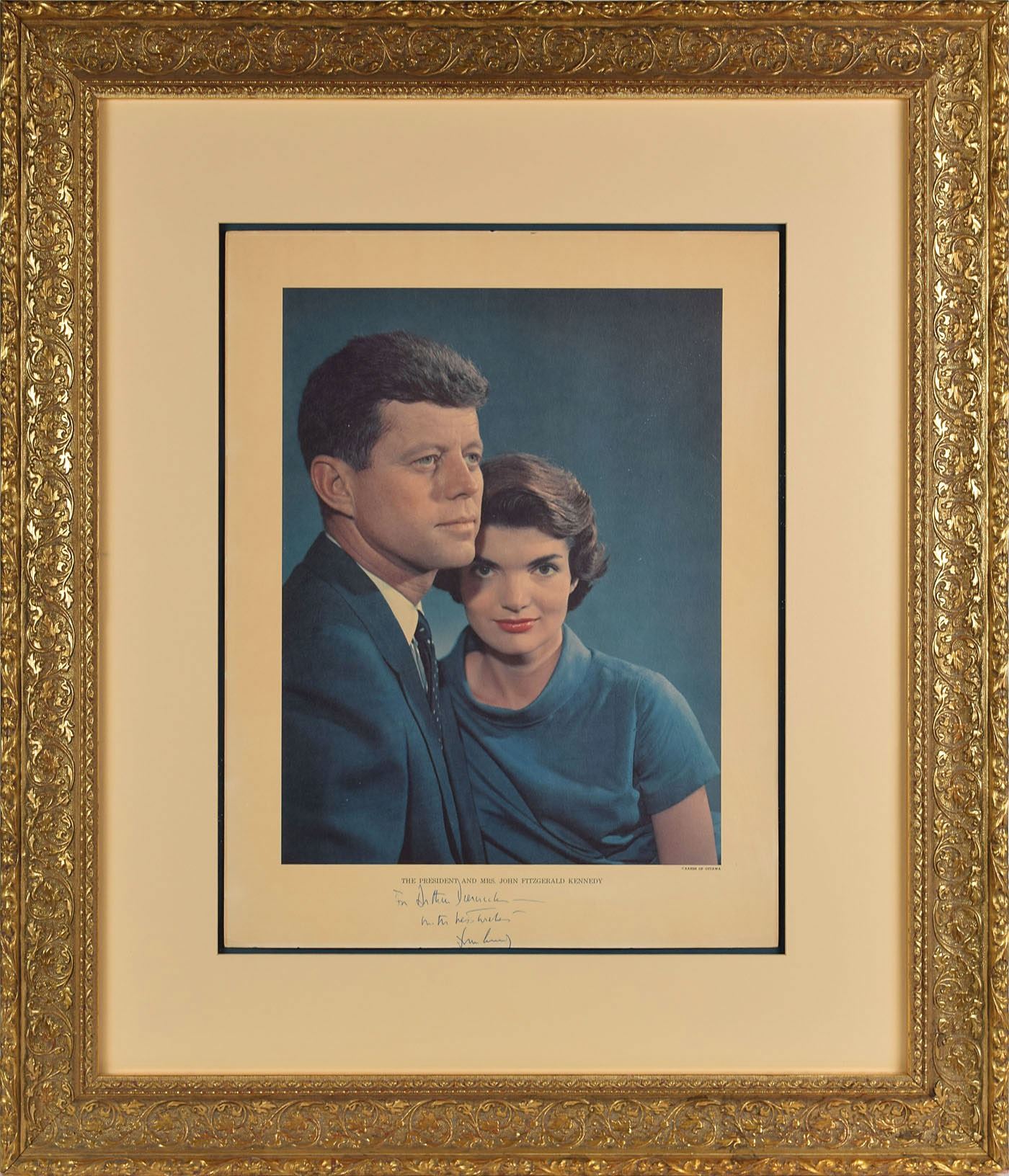 Brilliant color 17 x 22 Yousuf Karsh photographic portrait print of John and Jacqueline Kennedy, captioned "The President and Mrs. John Fitzgerald Kennedy," signed and inscribed in the lower border in blue ballpoint, "For Arthur Diernick—with best wishes—John Kennedy.” Printed text in the lower right border credits the photo to Ottawa of Karsh. Ornately matted and framed to an overall size of 31 x 35.5. In fine condition, with a few small creases to the borders. Accompanied by a full letter of authenticity from PSA/DNA.