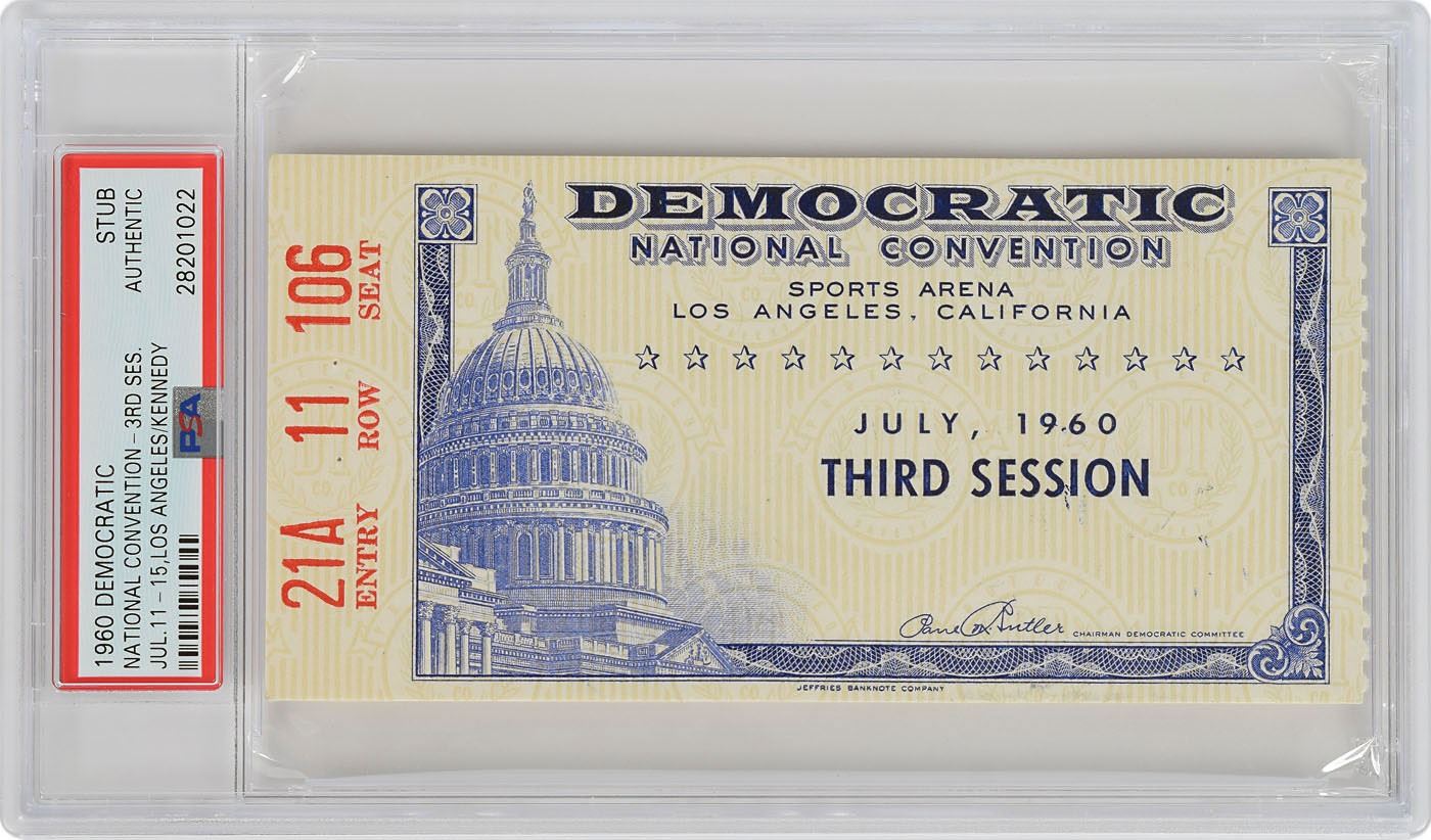 Ticket stub for the third session of the 1960 Democratic National Convention at which John F. Kennedy was nominated for president, 5.5 x 2.75, held at the Sports Arena in Los Angeles, California. Encapsulated in a plastic PSA/DNA authentication holder. In very fine condition.