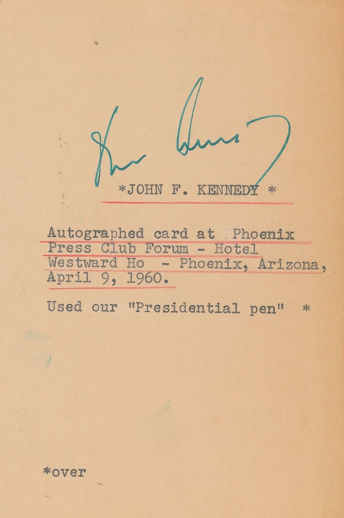 Desirable fountain pen signature, "John Kennedy,” on an off-white 4 x 6 card. Typed collector's notations below indicate that it was signed at the Phoenix Press Club Forum, held at the Hotel Westward Ho in Phoenix Arizona, on April 9, 1960, during JFK's presidential campaign. In fine condition. Accompanied by a modern 8 x 10 reprint of a candid photograph of Kennedy taken on the occasion.