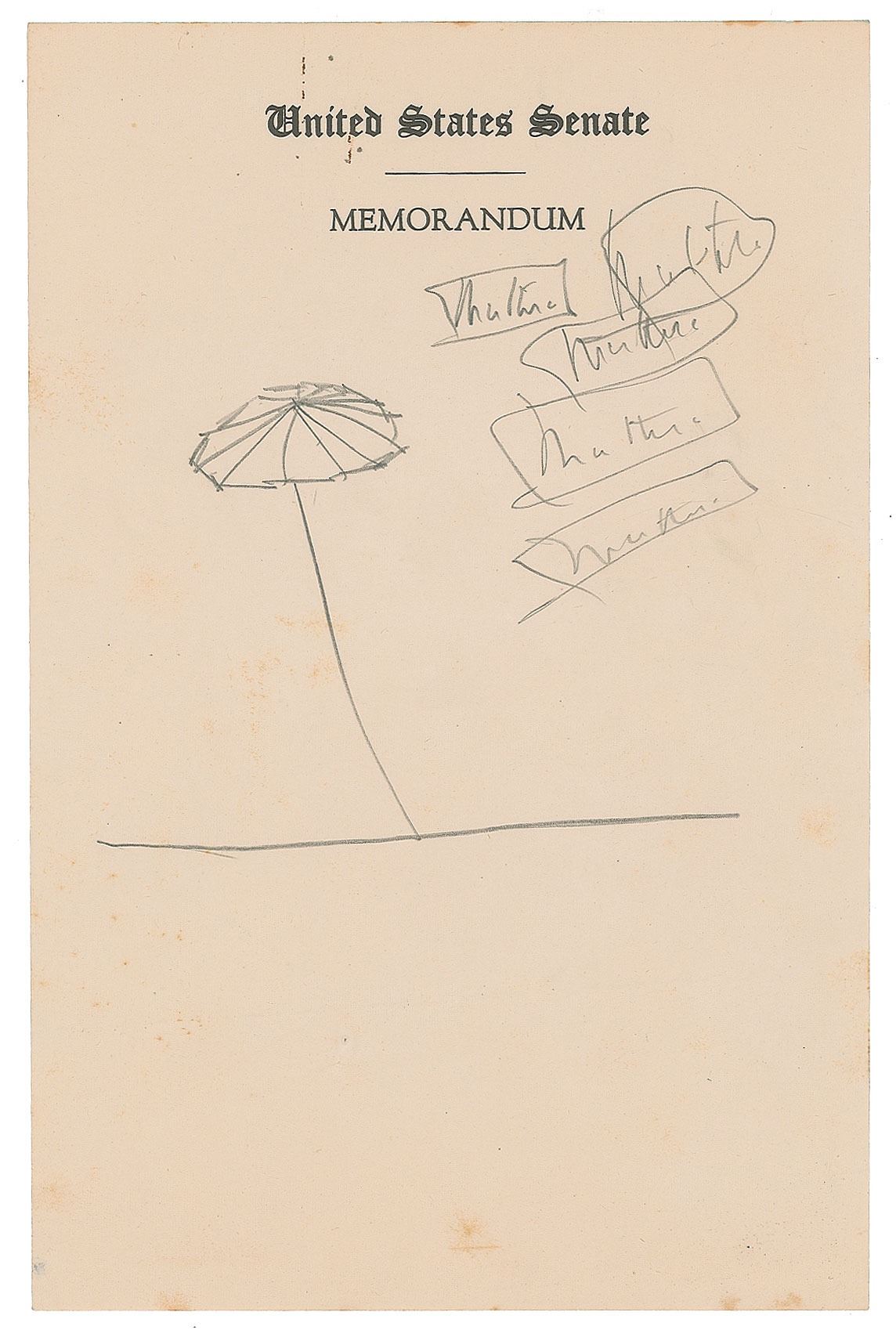 Handwritten notes and doodles by Senator John F. Kennedy, accomplished in pencil on an off-white sheet 5.25 x 8 of United States Senate, Memorandum stationery. The sheet features a single sketch of what appears to be an umbrella or parasol, with Kennedy writing the same word a total of five times to right side; the unknown word seems to read as "Multer" or perhaps "Mutter." In very good to fine condition, with light creasing, and some small stains to the bottom edge.
