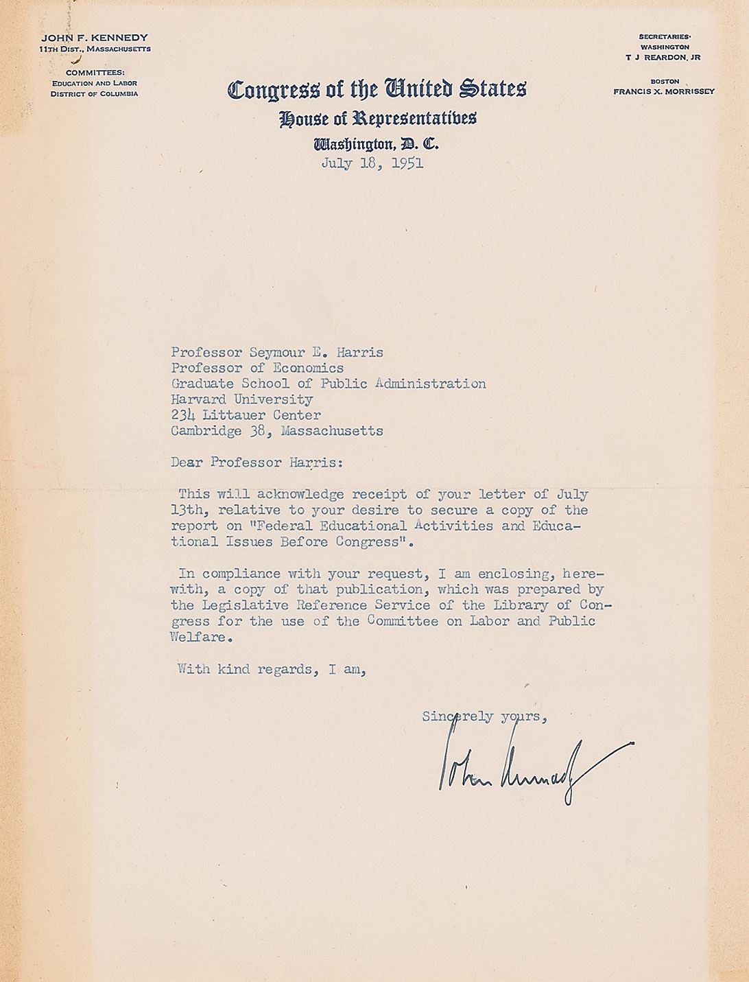 TLS signed “John Kennedy,” one page, 8 x 10.5, House of Representatives letterhead, July 18, 1951. Letter to Harvard University economist Seymour E. Harris, in full: "This will acknowledge receipt of your letter of July 13th, relative to your desire to secure a copy of the report on 'Federal Educational Activities and Educational Issues Before Congress.' In compliance with your request, I am enclosing, herewith, a copy of that publication, which was prepared by the Legislative Reference Service of the Library of Congress for the use of the Committee on Labor and Public Welfare." In very good to fine condition, with some light creasing, and toning along the side edges.