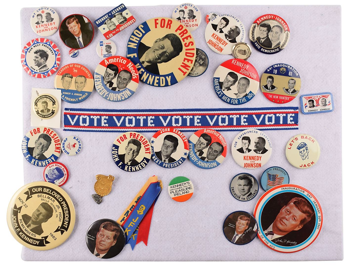 Collection of more than 35 pins, buttons, and ribbons associated with President John F. Kennedy, measuring between 3/4? and 6?, including twelve jugate campaign buttons with JFK and vice presidential running mate Lyndon B. Johnson, several different "For President" portrait pins, an Irish button, a Vari-Vue flasher button, a "Let's Back Jack" caricature button, two versions of a 1983 Belmar Jr. High button, and and various others. Displayed on a 27.5 x 22 felt-covered board. In fine condition.
