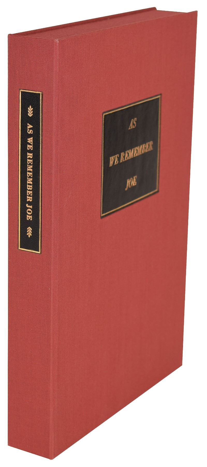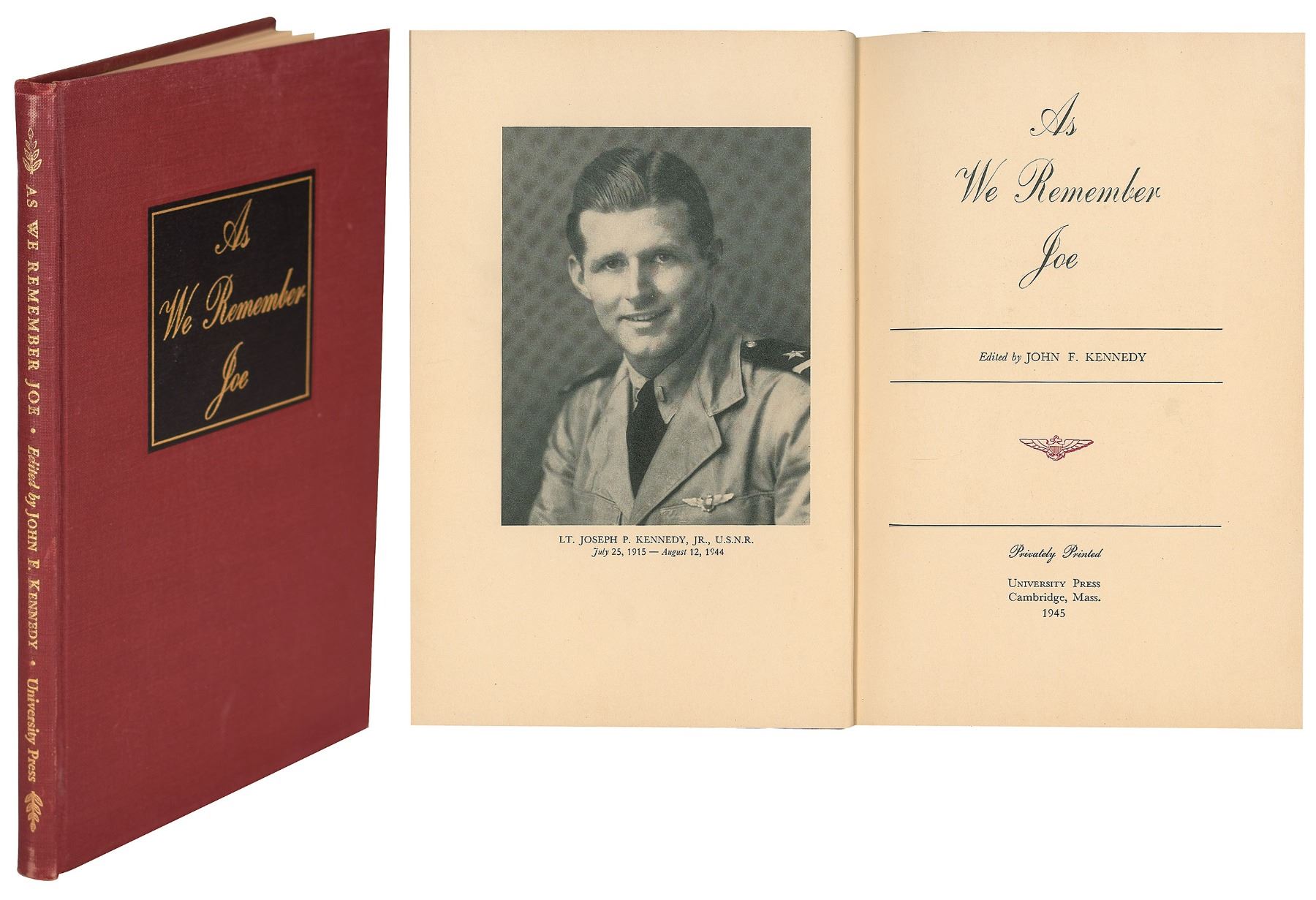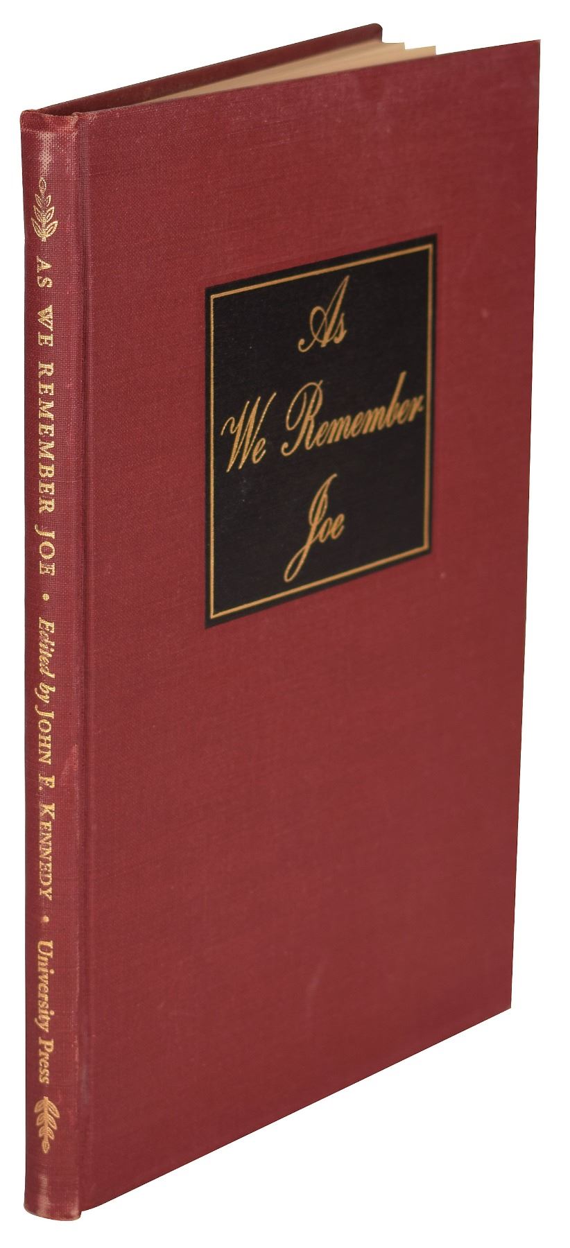 Rare unsigned book: As We Remember Joe. Privately printed. Cambridge, Massachusetts: University Press, 1945. Hardcover with rare original Mylar jacket, 6.25 x 9.25, 75 pages. Includes a handsome custom-made cloth-bound clamshell case. In fine to very fine condition. With very few privately printed, this volume contains the reminiscences of family and friends of Joseph P. Kennedy, Jr. JFK had this rare volume prepared as a 1945 Christmas gift for his immediate family and friends of his elder brother. A highly sought-after first edition, limited to only 250 copies.