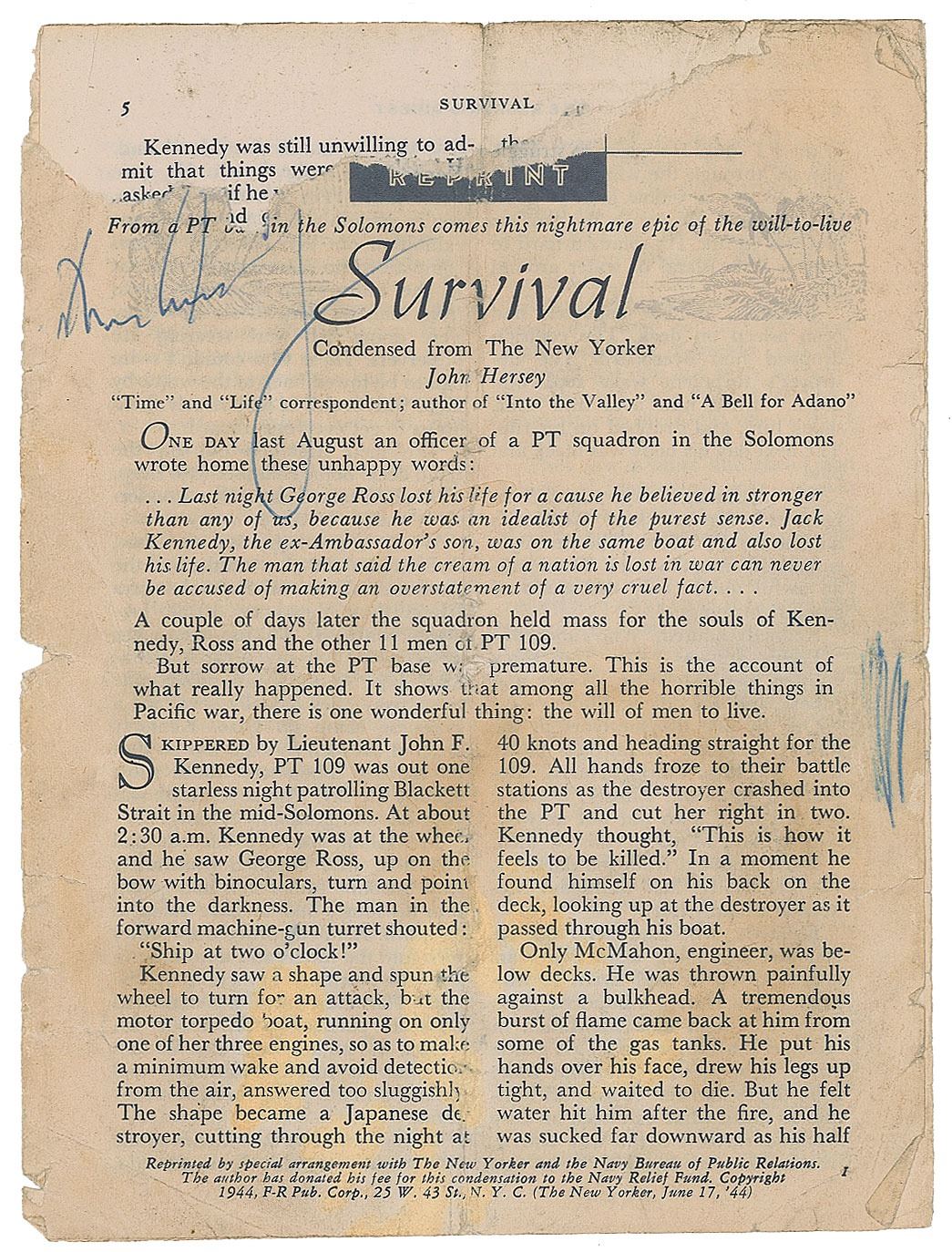 Pamphlet from The Reader's Digest containing a condensed version of John Hersey's 'Survival,' six pages, 5.5 x 7.5, signed on the first page in blue ballpoint, "John Kennedy." In good condition, with intersecting folds, creasing and staining, edge tears, and paper loss affecting the top of Kennedy's last name. Survival was Hersey's detailed account of how JFK battled to save the crew of PT-109 while adrift in the South Pacific.