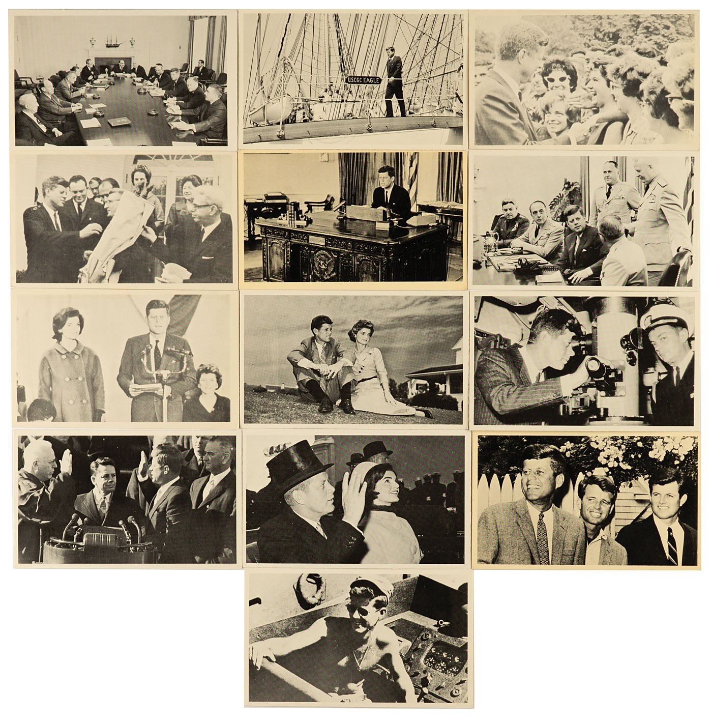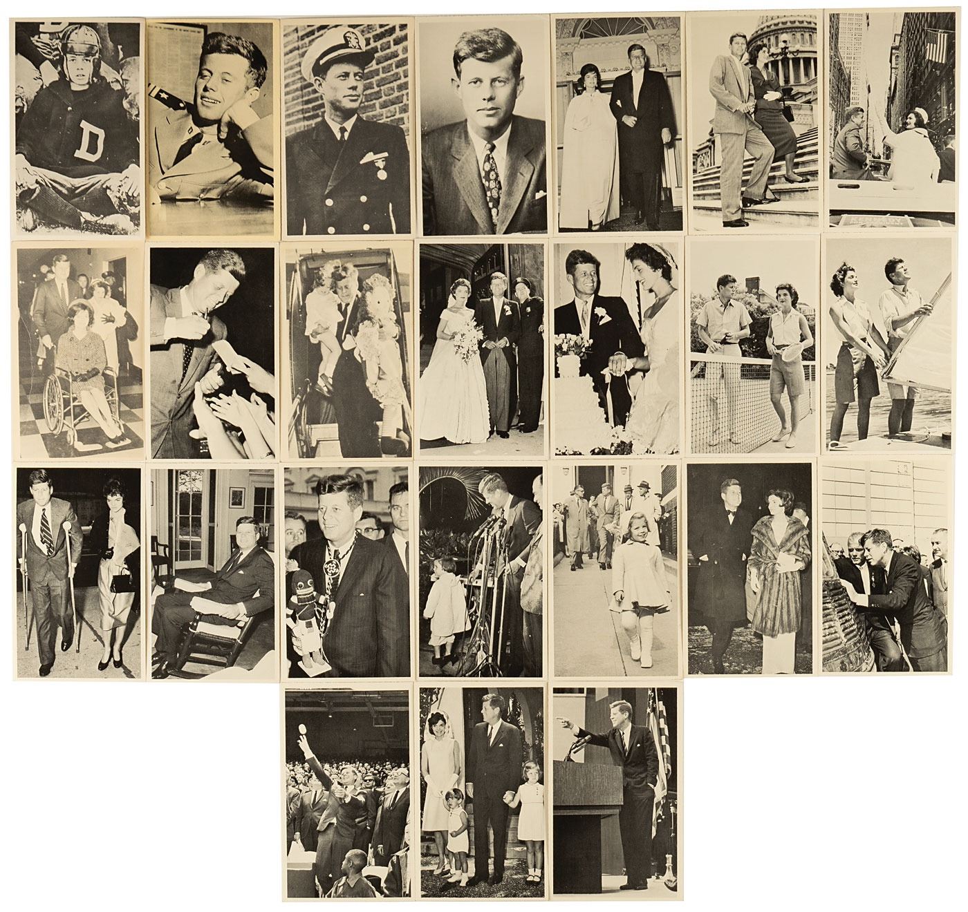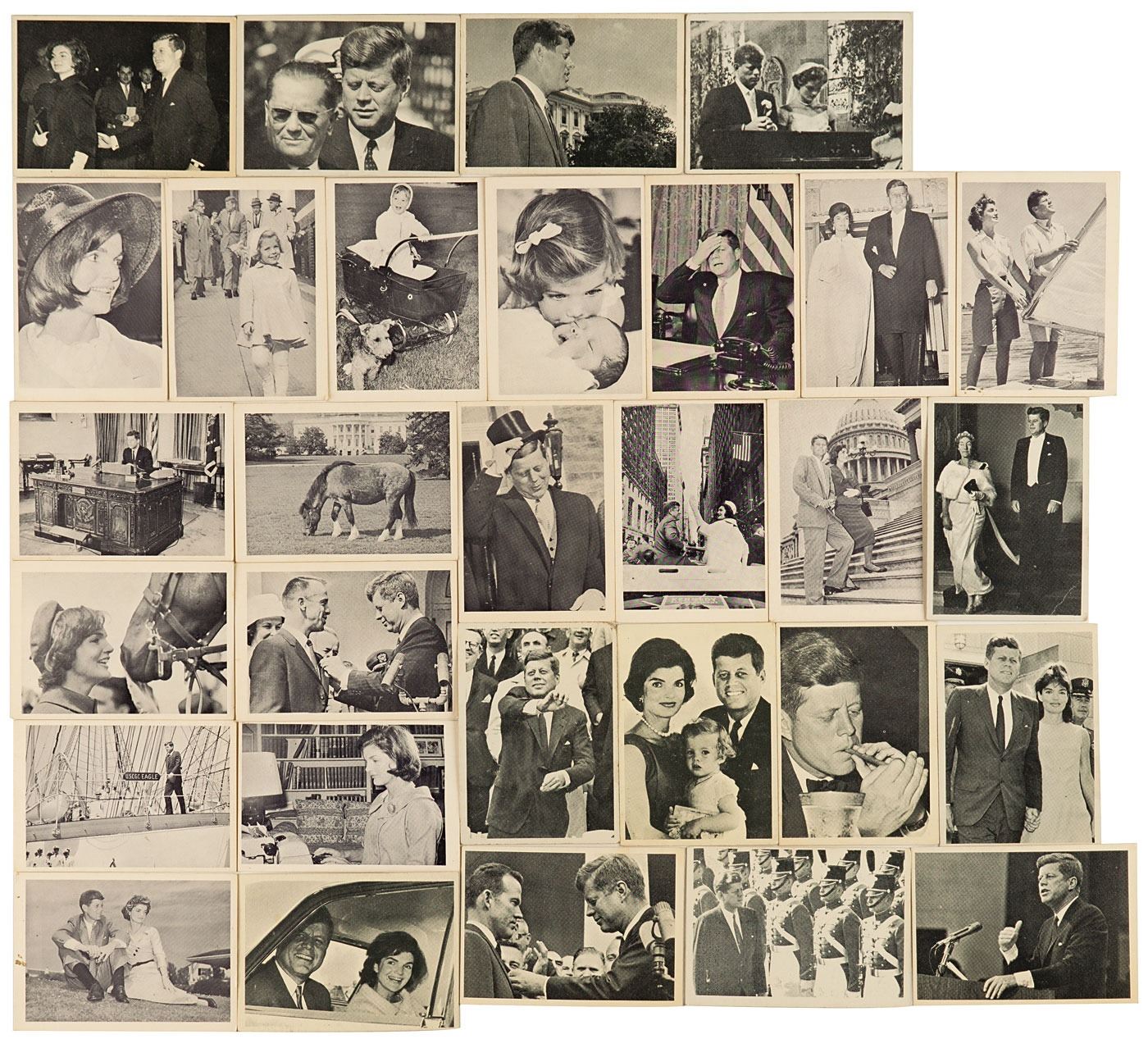 Collection of John F. Kennedy trading cards, including: 17 cards printed by Rosan in 1963; 13 cards from the 1964 Topps JFK set; and 37 oversized trading cards (3.5˝ x 5.75˝) chronicling Kennedy's life, by an unknown publisher. In overall very good to fine condition.
