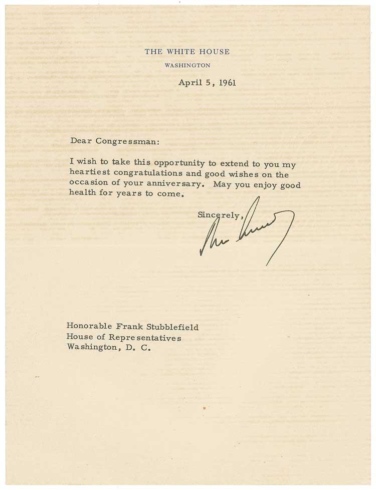 TLS as president, one page, 6.75 x 9, White House letterhead, April 5, 1961. Letter to Congressman Frank Stubblefield. In full: “I wish to take this opportunity to extend to you my heartiest congratulations and good wishes on the occasion of your anniversary. May you enjoy good health for years to come.” Light horizontal toning from previous photo album storage, and a bisecting horizontal fold through small portion of signature, otherwise fine condition. Pre-certified John Reznikoff/PSA/DNA and RRAuction COA.