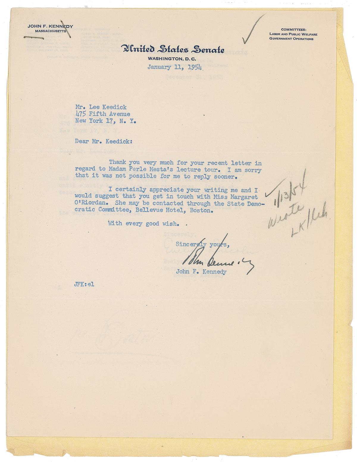 TLS, one page, 8 x 10.5, United States Senate letterhead, January 11, 1954. Letter to Lee Keedick in New York. In full: “Thank you very much for your recent letter in regard to Madame Perle Mesta’s lecture tour. I am sorry that it was not possible for me to reply sooner. I certainly appreciate your writing me and I would suggest that you get in touch with Miss Margaret O’Riordan. She may be contacted through the State Democratic Committee, Bellevue Hotel, Boston.” Accompanied by a December 1953, letter from Evelyn Lincoln, informing Keedick that Kennedy is away at the moment, as well as carbon copies of two earlier letters from Keedick to Kennedy. Two staple holes to top left, two pencil checks and a notation to right side, and a couple of creases, otherwise fine condition. Pre-certified John Reznikoff/PSA/DNA and RRAuction COA.