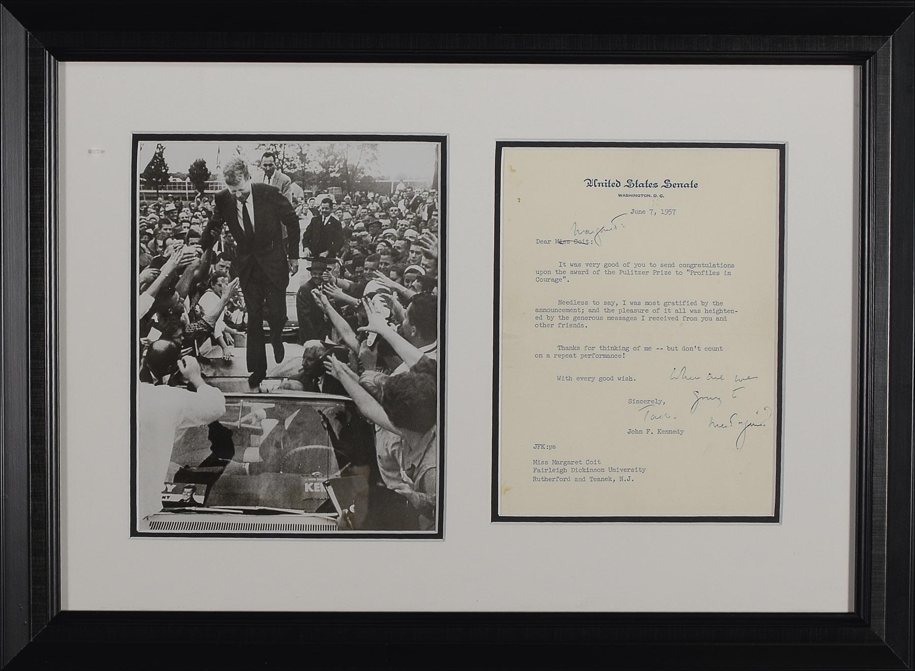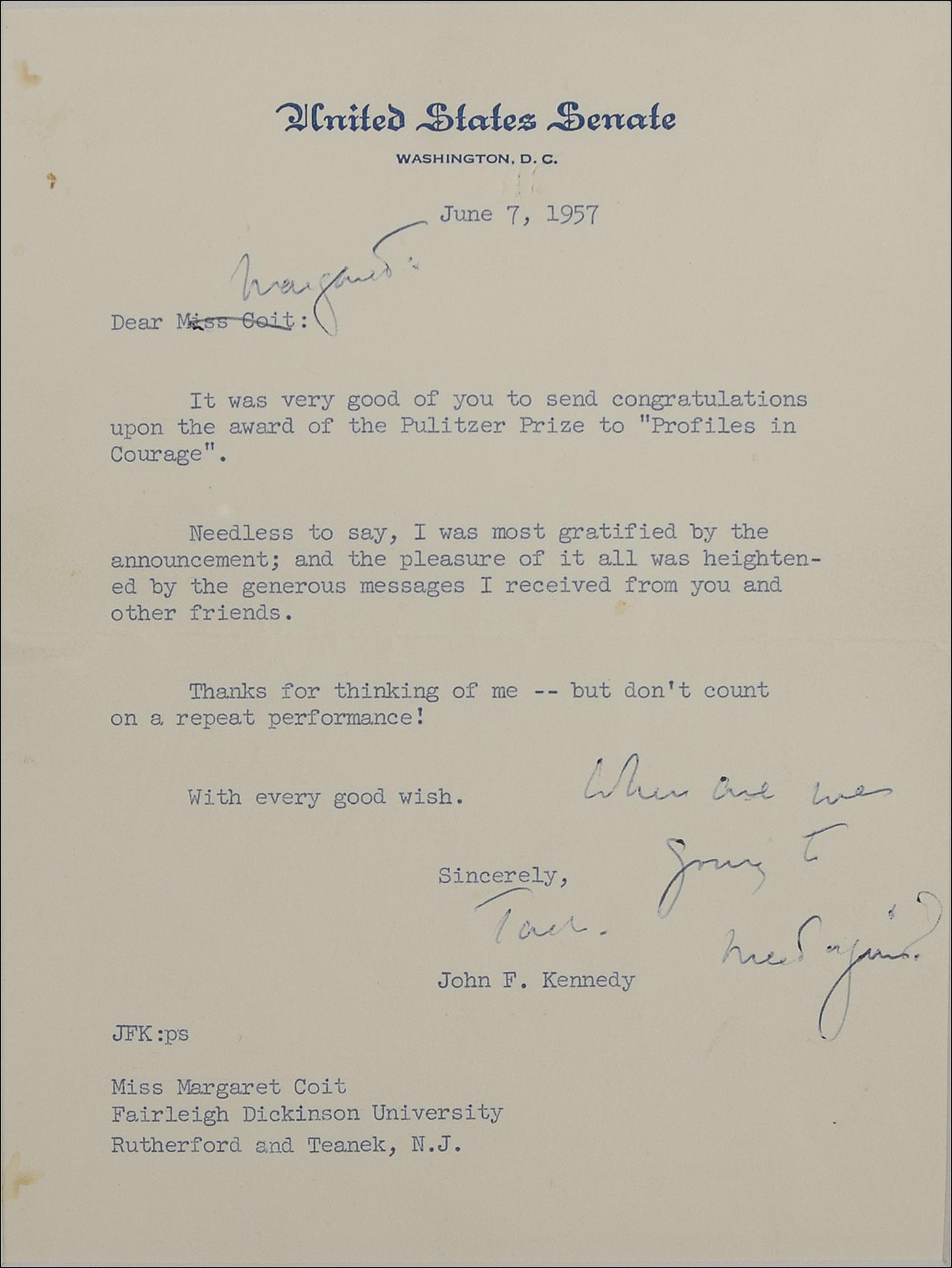 Fabulous vintage matte-finish 8 x 10 photo of Kennedy seated at his desk, beautifully signed and inscribed in the lower border in blue ink “For Evelyn Jones—with the warm regards and appreciation of John Kennedy.” In fine condition, with a few light surface creases to borders and a couple trivial edge dings. Pre-certified John Reznikoff/PSA/DNA and RRAuction COA.