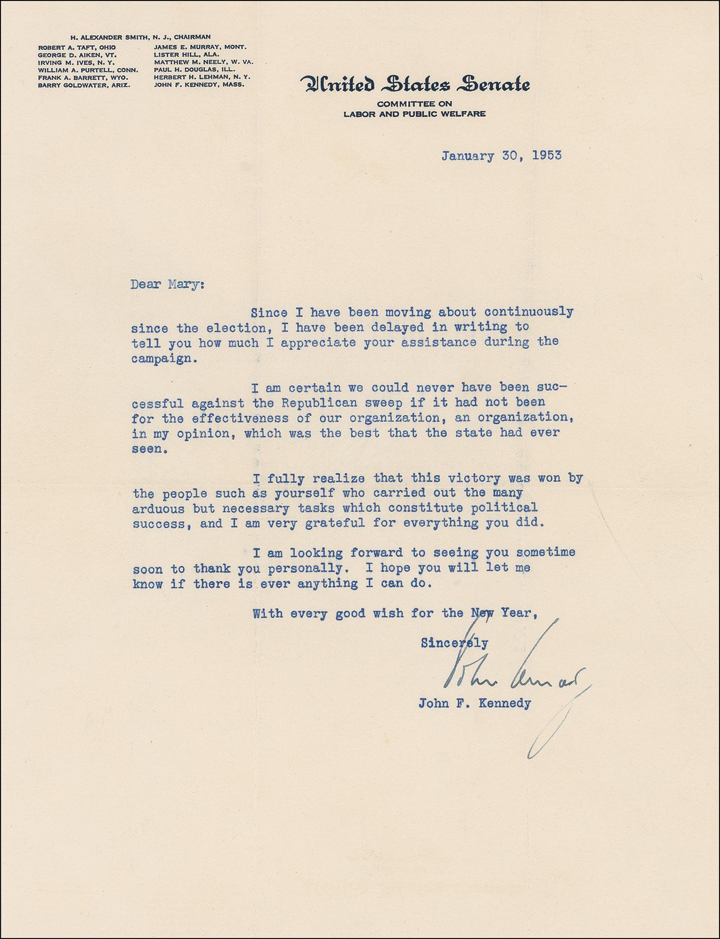 TLS, one page, 8 x 10.5, United States Senate letterhead, January 30, 1953. Kennedy sends his thanks to a campaign worker. In part, “I am certain we could never have been successful against the Republican sweep if it had not been for the effectiveness of our organization, an organization, in my opinion, which was the best that the state had ever seen. I fully realize that this victory was won by the people such as yourself who carried out the many arduous but necessary tasks which constitute political success, and I am very grateful for everything you did.” In fine condition, with intersecting folds, one through a single letter of signature. Accompanied by the original mailing envelope bearing a pre-printed franking signature.