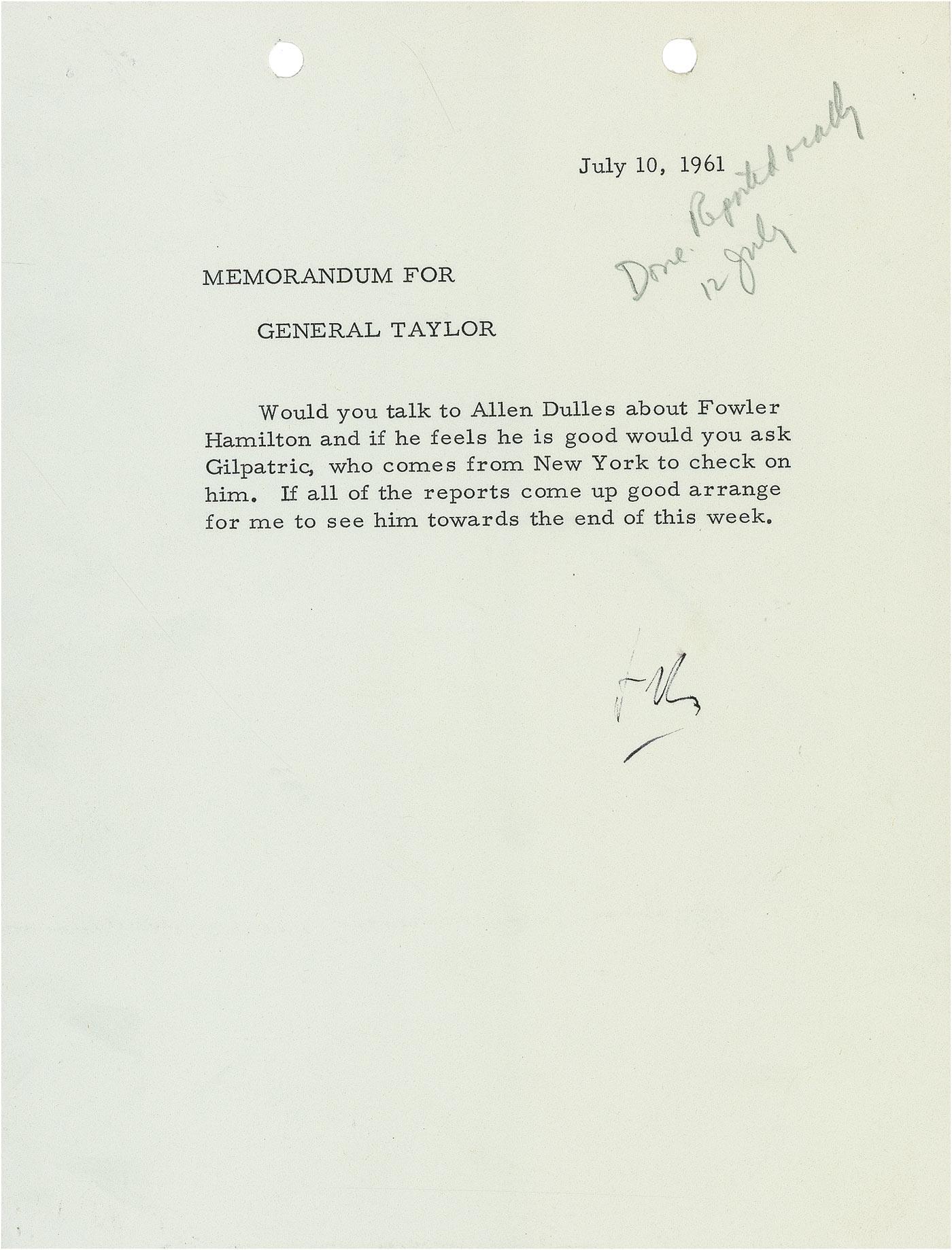 Typed memorandum as president hurriedly initialed “JK,” one page, 6.75 x 8.75, pale green White House stationery, July 10, 1961. To General Maxwell D. Taylor, Chairman of the Joint Chiefs of Staff, the memo reads, in full: “Would you talk to Allen Dulles about Fowler Hamilton and if he feels he is good would you ask Gilpatric, who comes from New York to check on him. If all of the reports come up good arrange for me to see him towards the end of this week.” General Taylor has penciled a note to himself in the upper right: “Done. Reported orally 12 July.” Two file holes in top blank margin, and staple holes and light bend to upper left, otherwise fine condition.