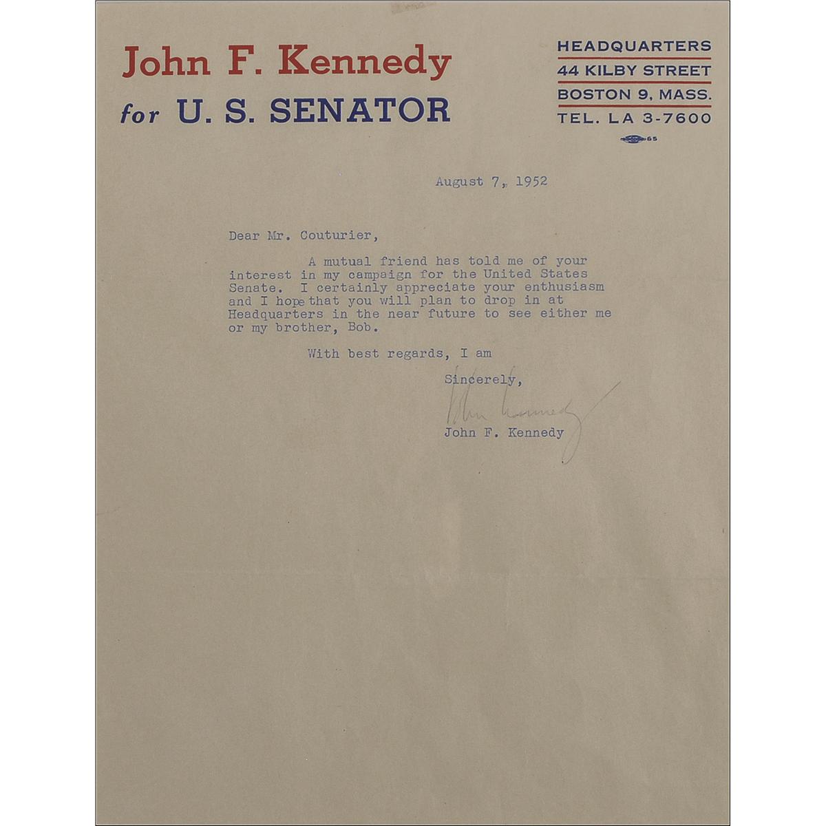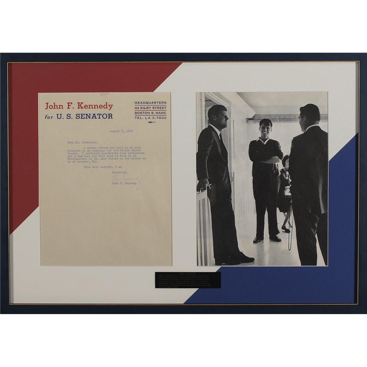 TLS signed “John Kennedy,” one page, 8 x 10.5, John F. Kennedy for U. S. Senator letterhead, August 7, 1952. Kennedy thanks Mr. Couturier, a supporter, and mentions his brother, future attorney general Robert F. Kennedy. In full: “A mutual friend has told me of your interest in my campaign for the United States Senate. I certainly appreciate your enthusiasm and I hope you will plan to drop in at Headquarters in the near future to see me or my brother, Bob.” Matted in red, white, and blue with a candid photo of JFK and RFK, and framed to an overall size of 22.75 x 16.25. In fine condition, with wrinkling to the page, a light shade of even toning, a small piece of old tape at the very top edge, and JFK’s signature a couple of shades light.